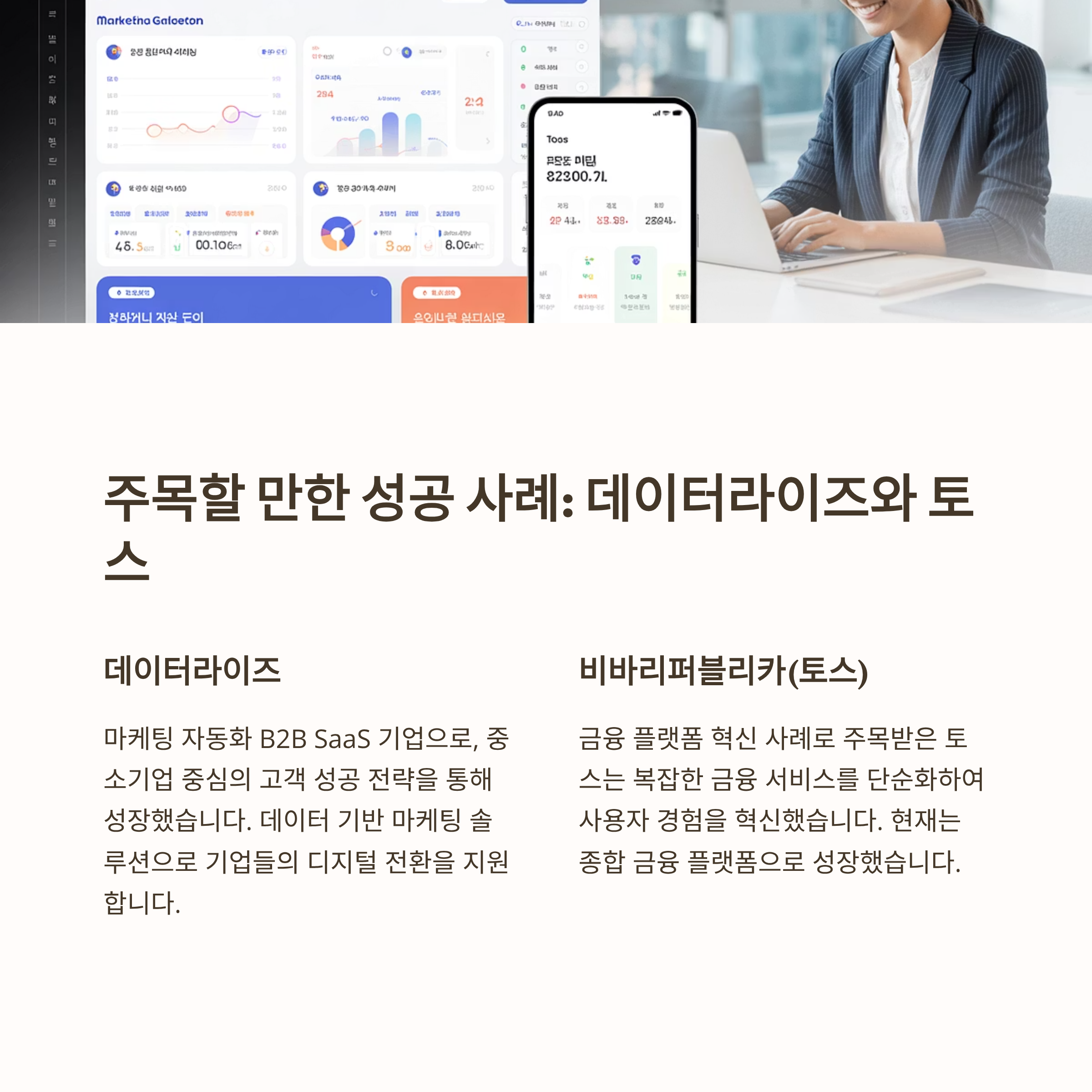 - 특히 데이터라이즈는 마케팅 자동화 B2B SaaS로 중소기업 중심 고객 성공 전략을 통해 성장했고, **비바리퍼블리카(토스)**는 금융 플랫폼 혁신 사례로 주목받았습니다 (futurechosun.com).