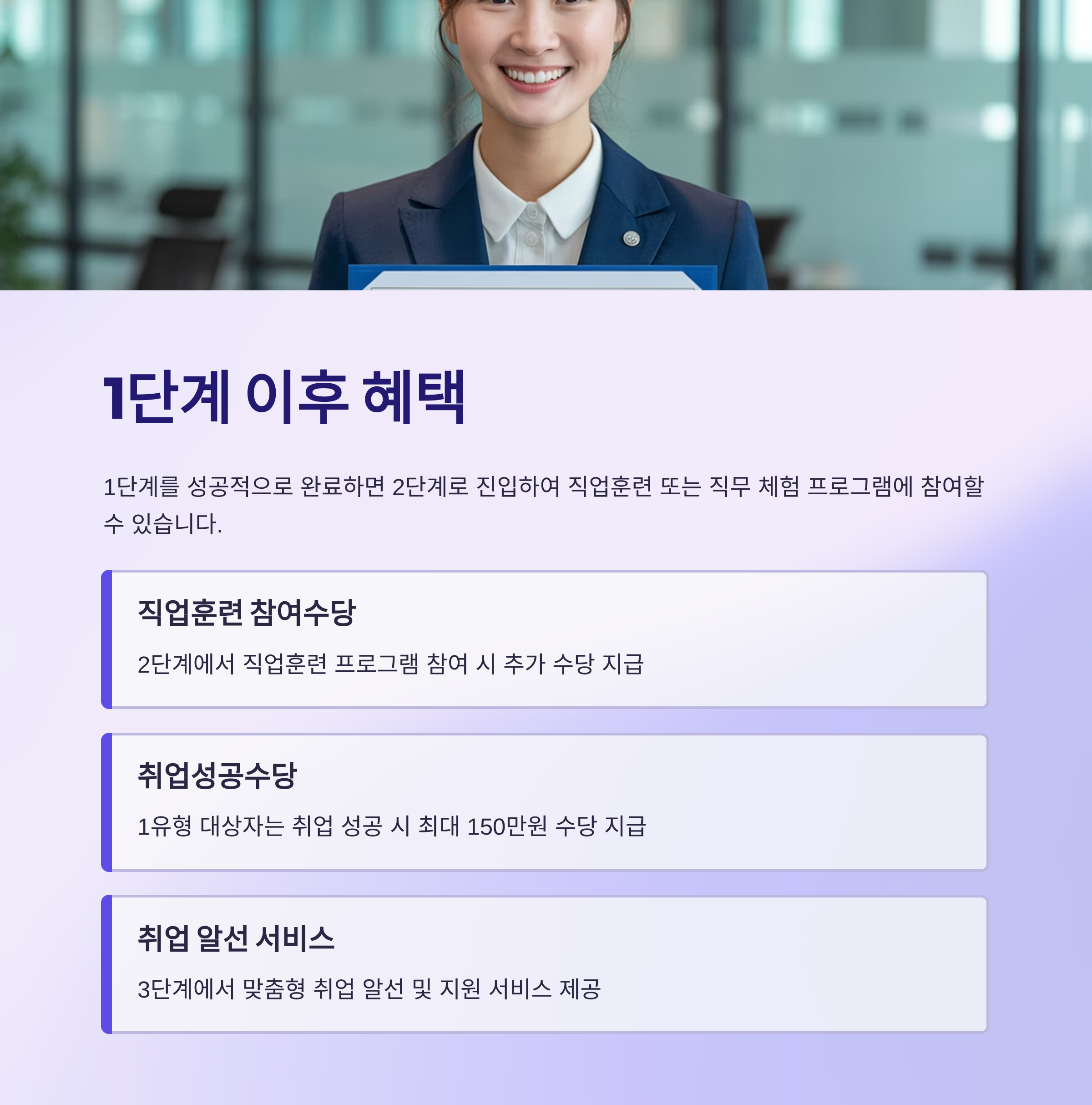 - 1단계를 완료하면 2단계 진입 : 직업훈련 또는 직무 체험 프로그램 참여
