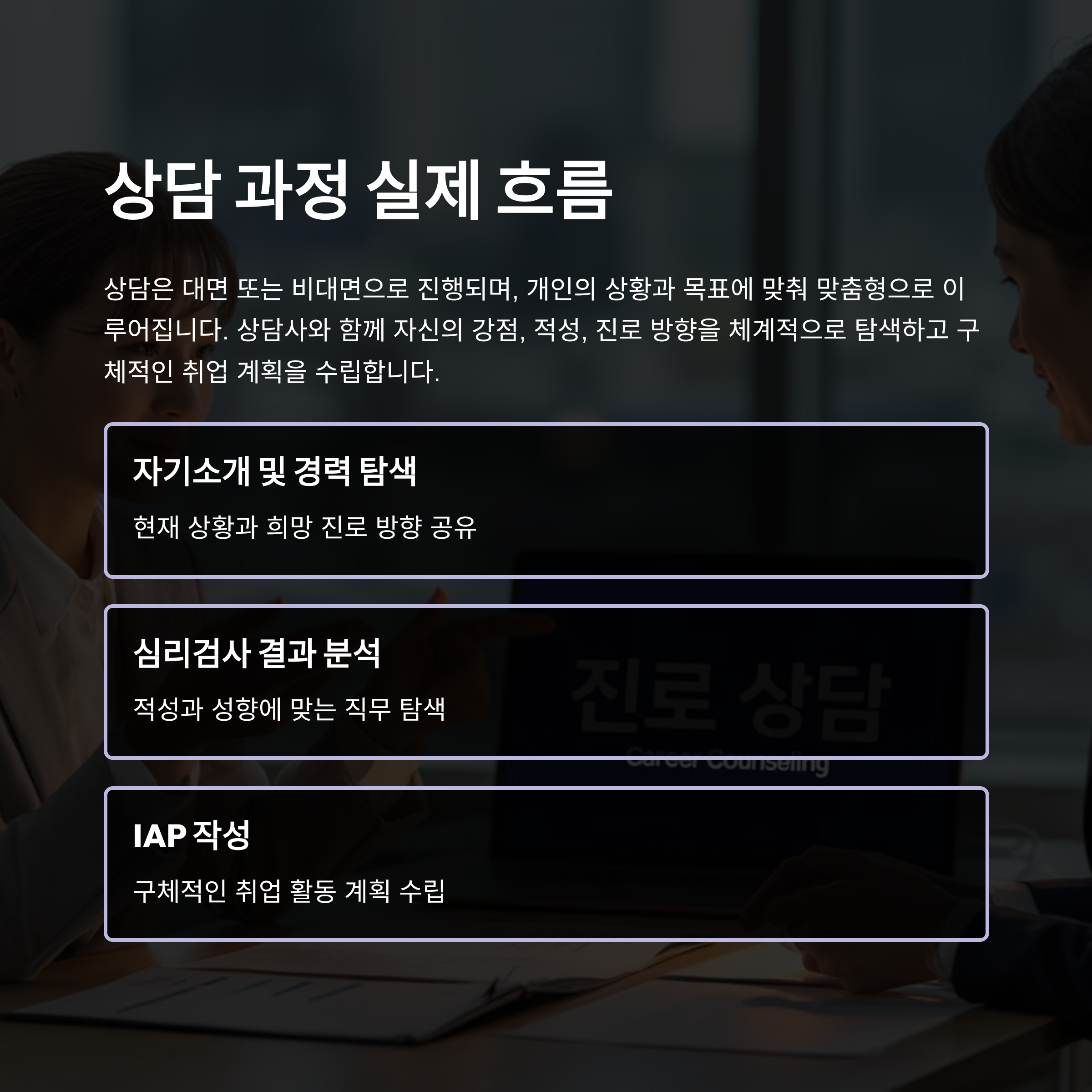 - 2차/3차 상담: 검사 결과 해석, IAP 작성, 향후 취업 활동 로드맵 수립