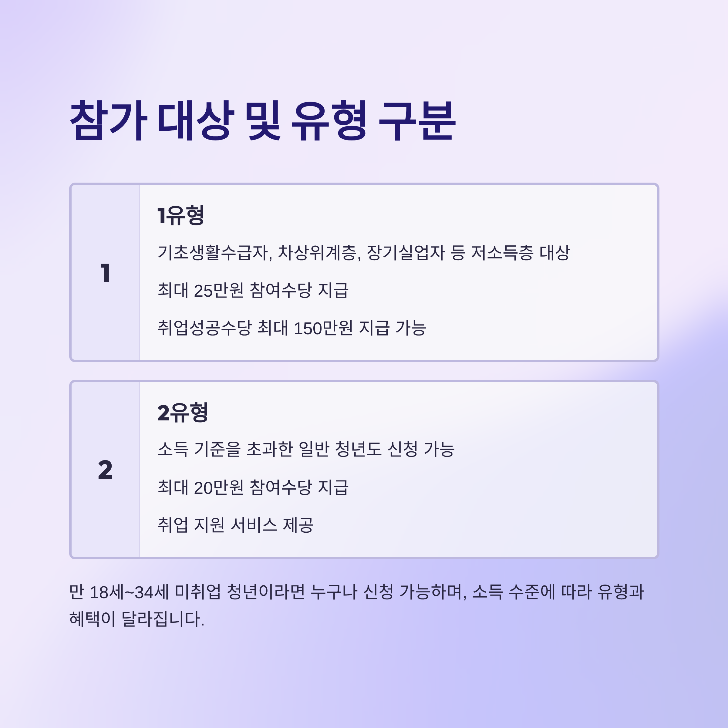 | 대상 | 만 18~34세 청년, 1유형(저소득취약) 및 2유형(소득 무관) |