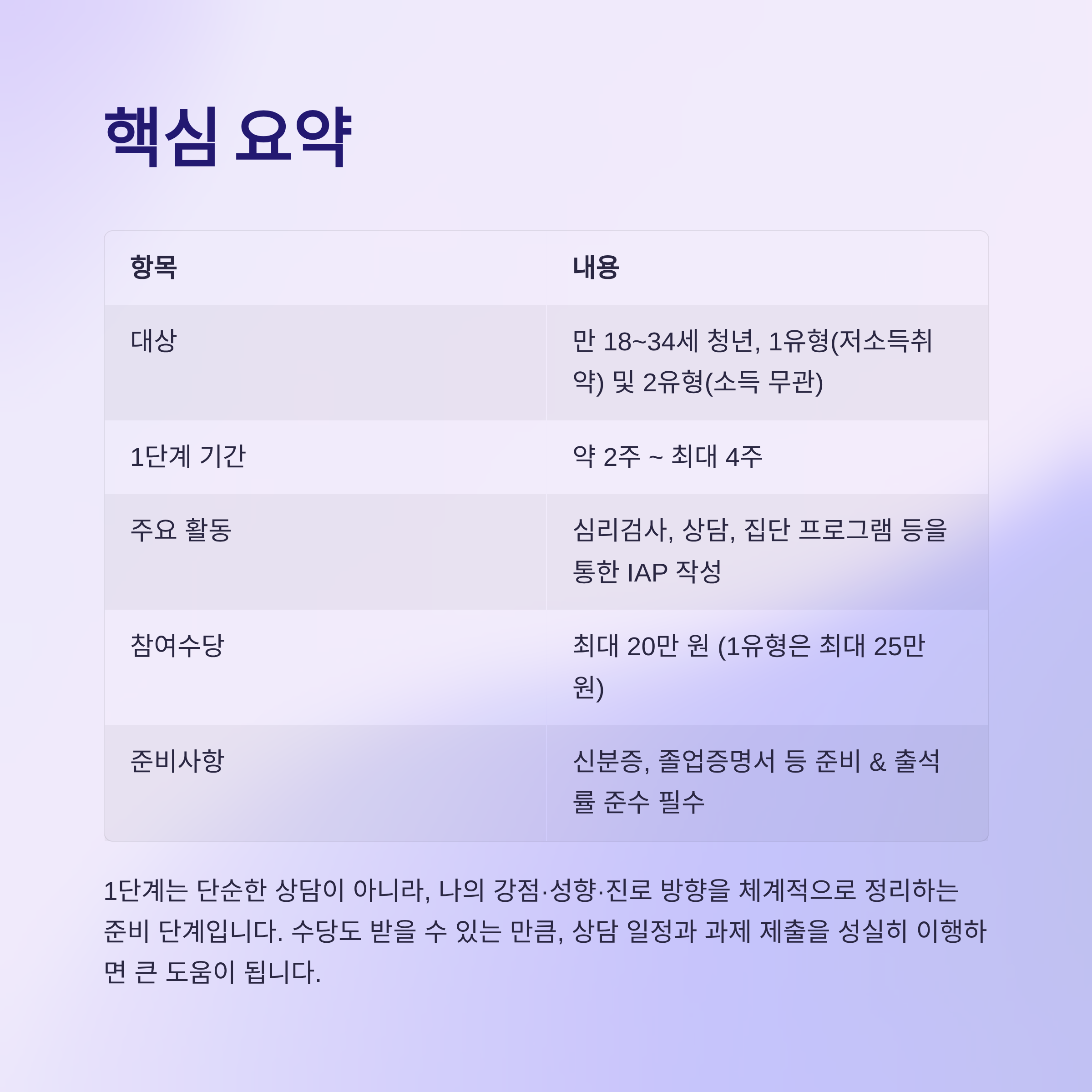 1단계는 단순한 상담이 아니라, 나의 강점·성향·진로 방향을 체계적으로 정리하는 준비 단계입니다.