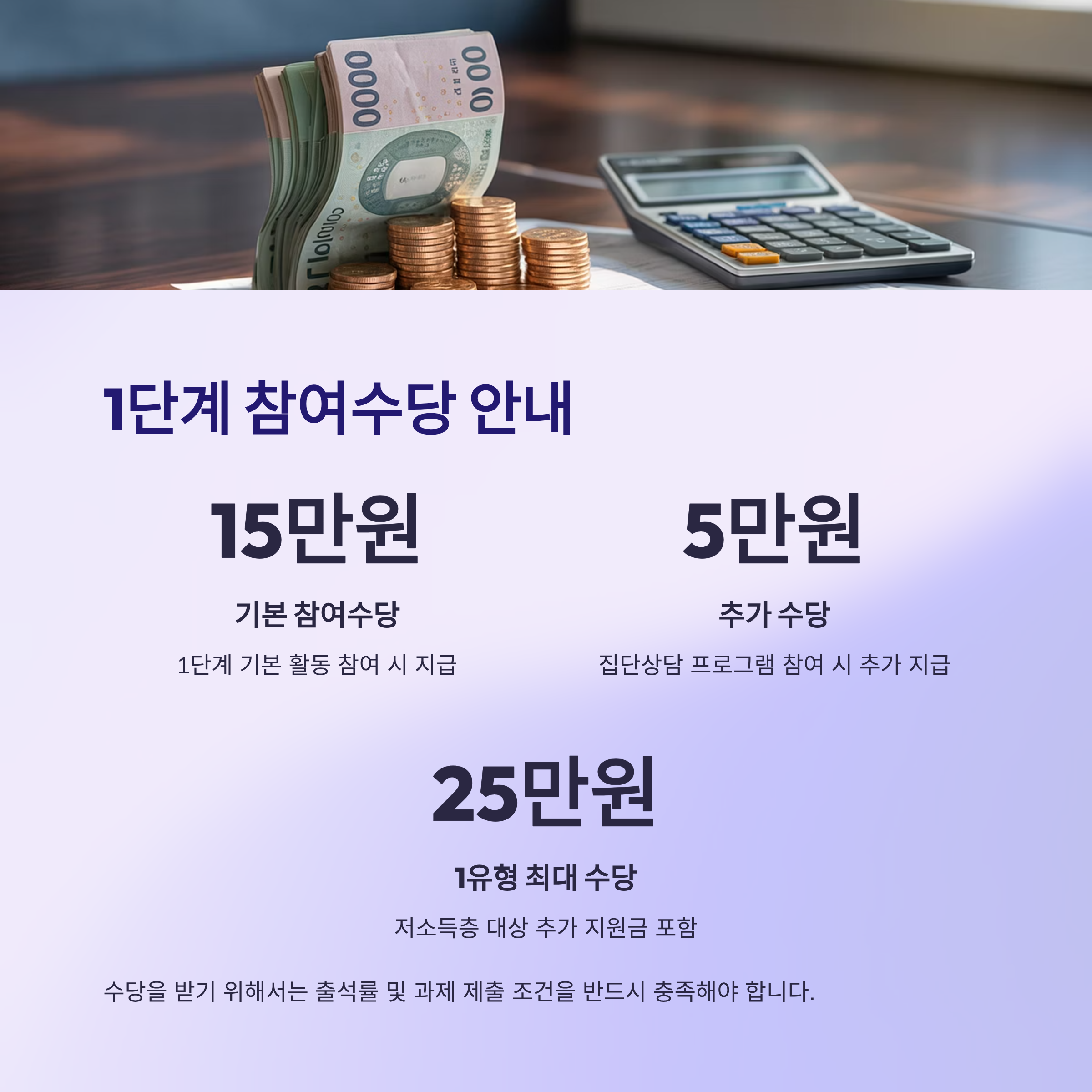 - 1단계 참여수당: 기본 15만 원 + 집단상담 참여 시 최대 추가 5만 원, 총 최대 20만 원 지급.