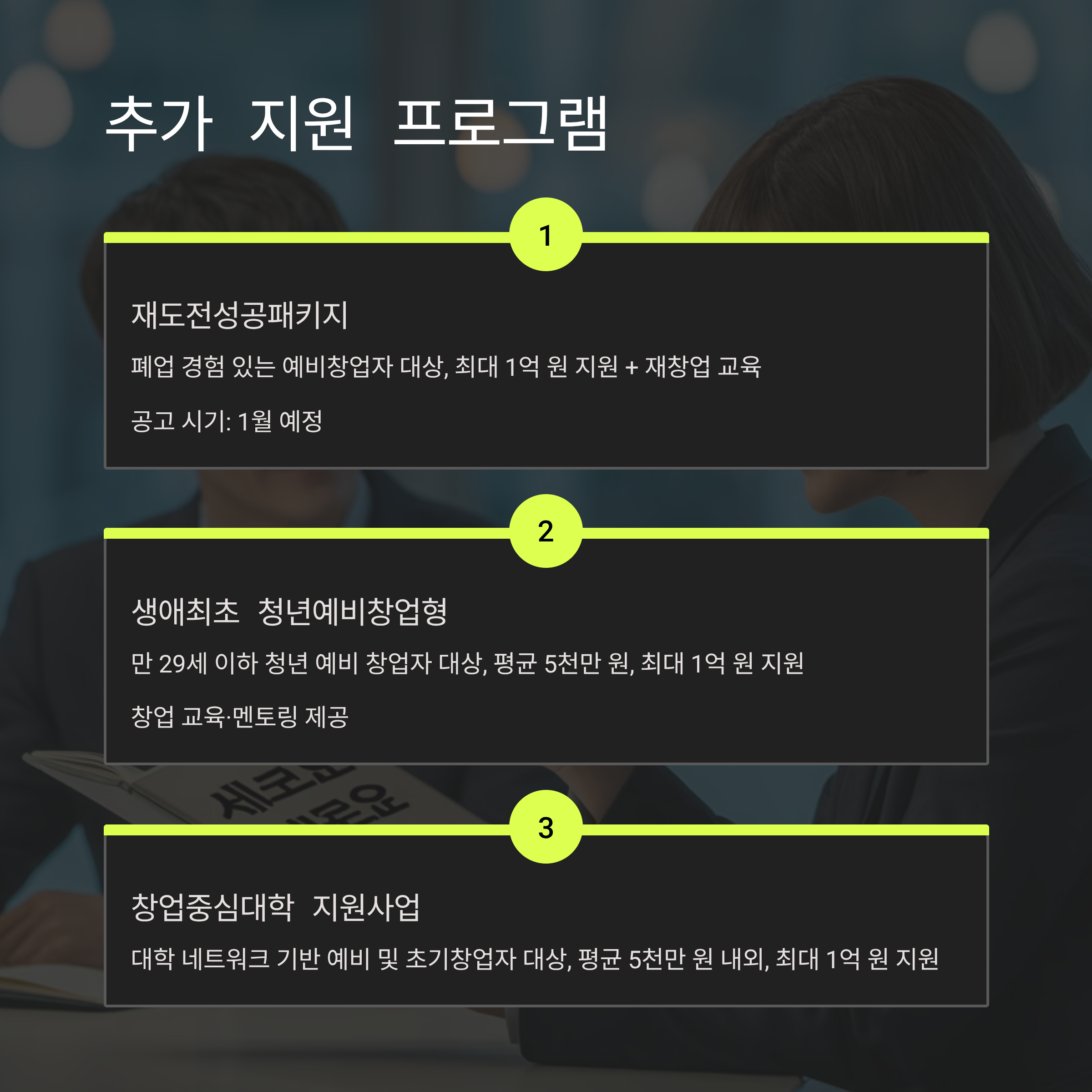 | 재도전 | 재도전성공패키지 | 폐업 경험 있는 예비창업자 | 최대 1억 원 지원 + 재창업 교육 | 1월 공고 예정 (Brunch Story, 세상의 조각) |