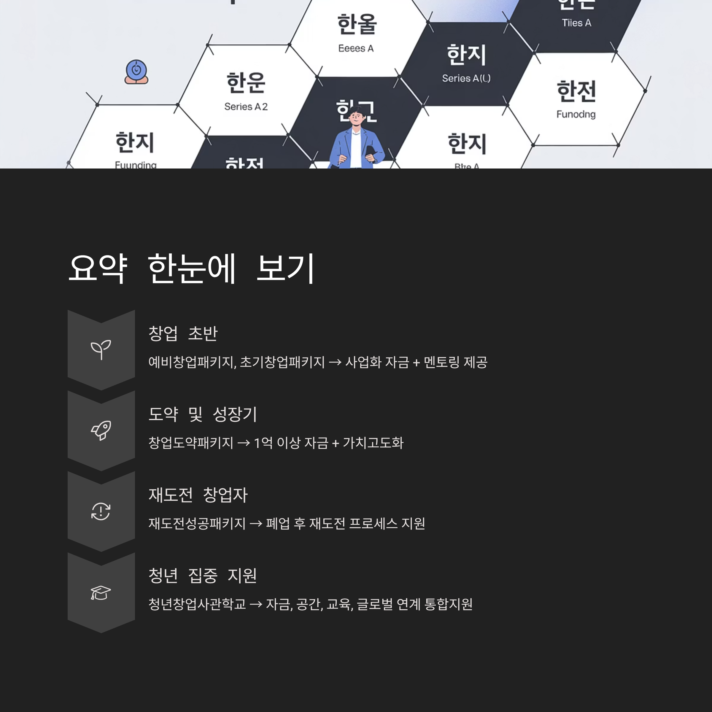 - 재도전 창업자: 재도전성공패키지 → 폐업 후 재도전 프로세스 지원
