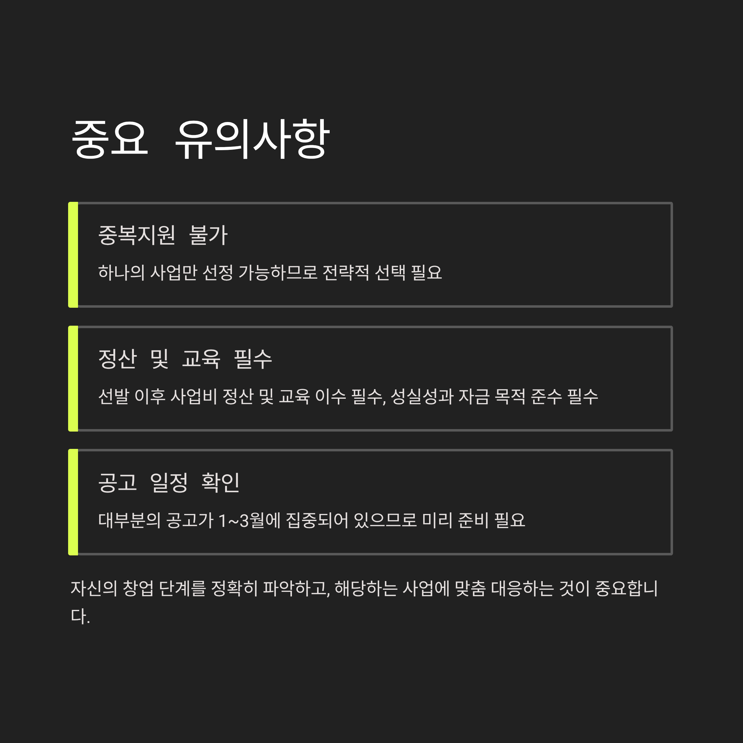 - 중복지원 불가, 하나의 사업만 선정 가능하므로 전략적 선택 필요.