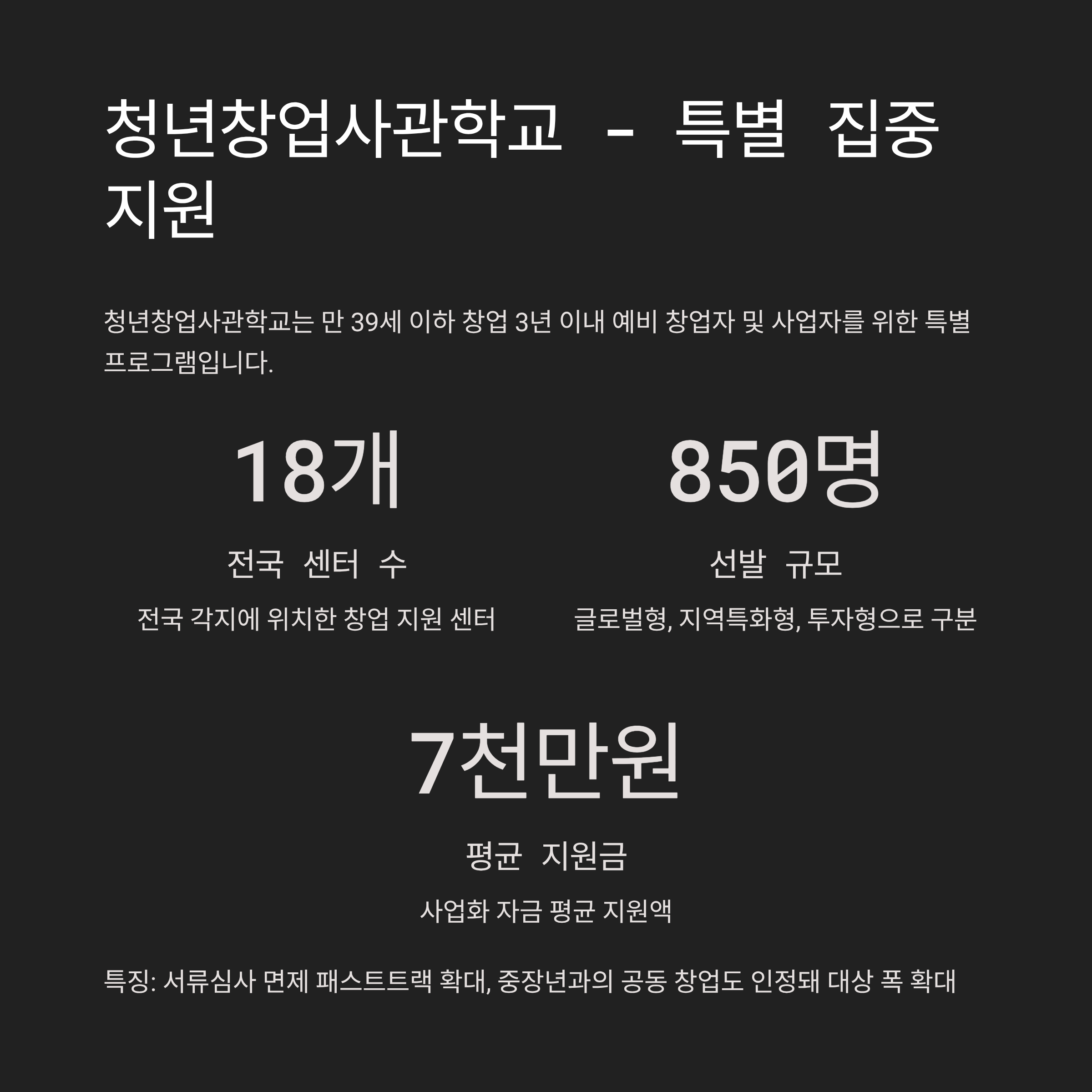 - 지원 규모: 전국 18개 센터, 총 850명 선발(글로벌형, 지역특화형, 투자형 구분) (중소벤처기업부).