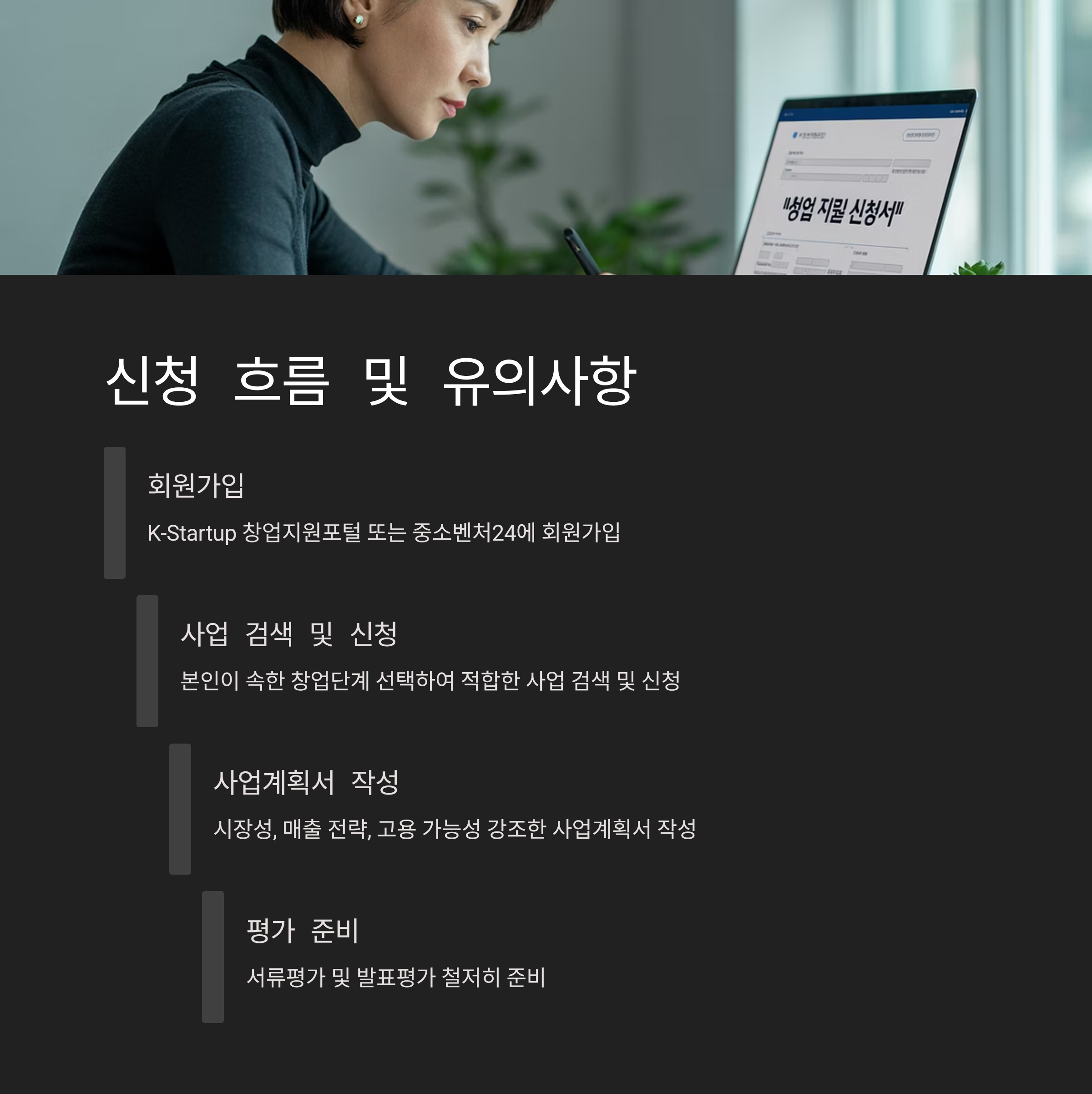 - K‑Startup 창업지원포털 또는 중소벤처24에 회원가입 후 본인이 속한 창업단계 선택하여 사업 검색 및 신청 (K-Startup 창업지원포털).