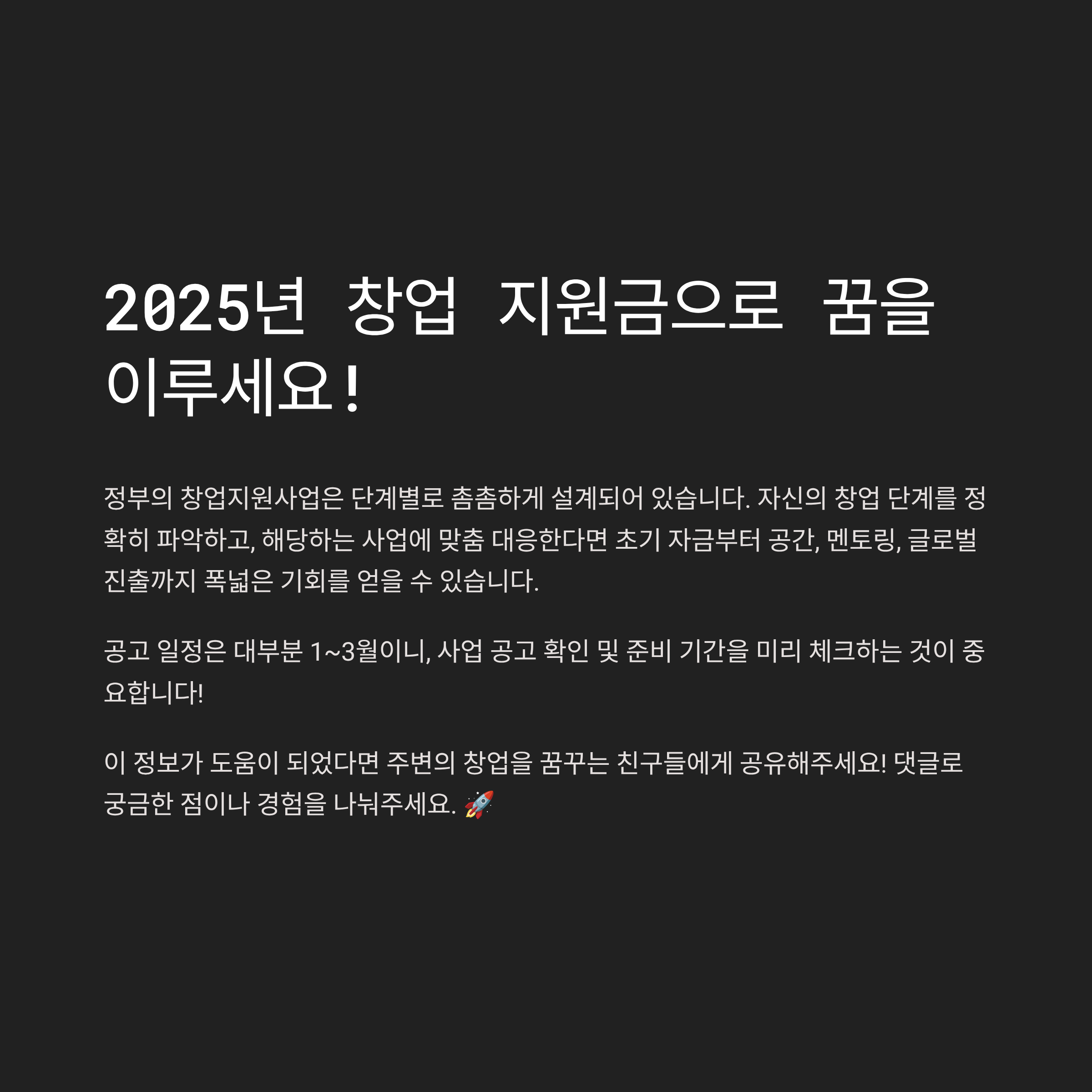 자신의 창업 단계를 정확히 파악하고, 해당하는 사업에 맞춤 대응한다면 초기 자금부터 공간, 멘토링, 글로벌 진출까지 폭넓은 기회를 얻을 수 있어요.