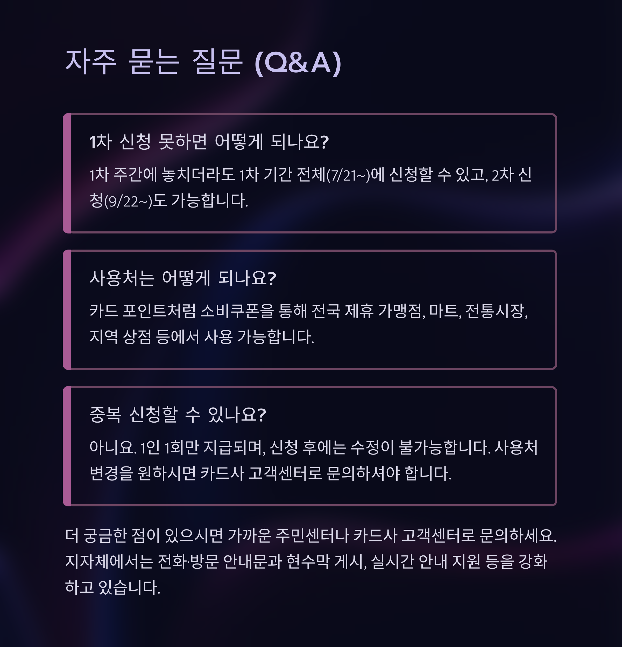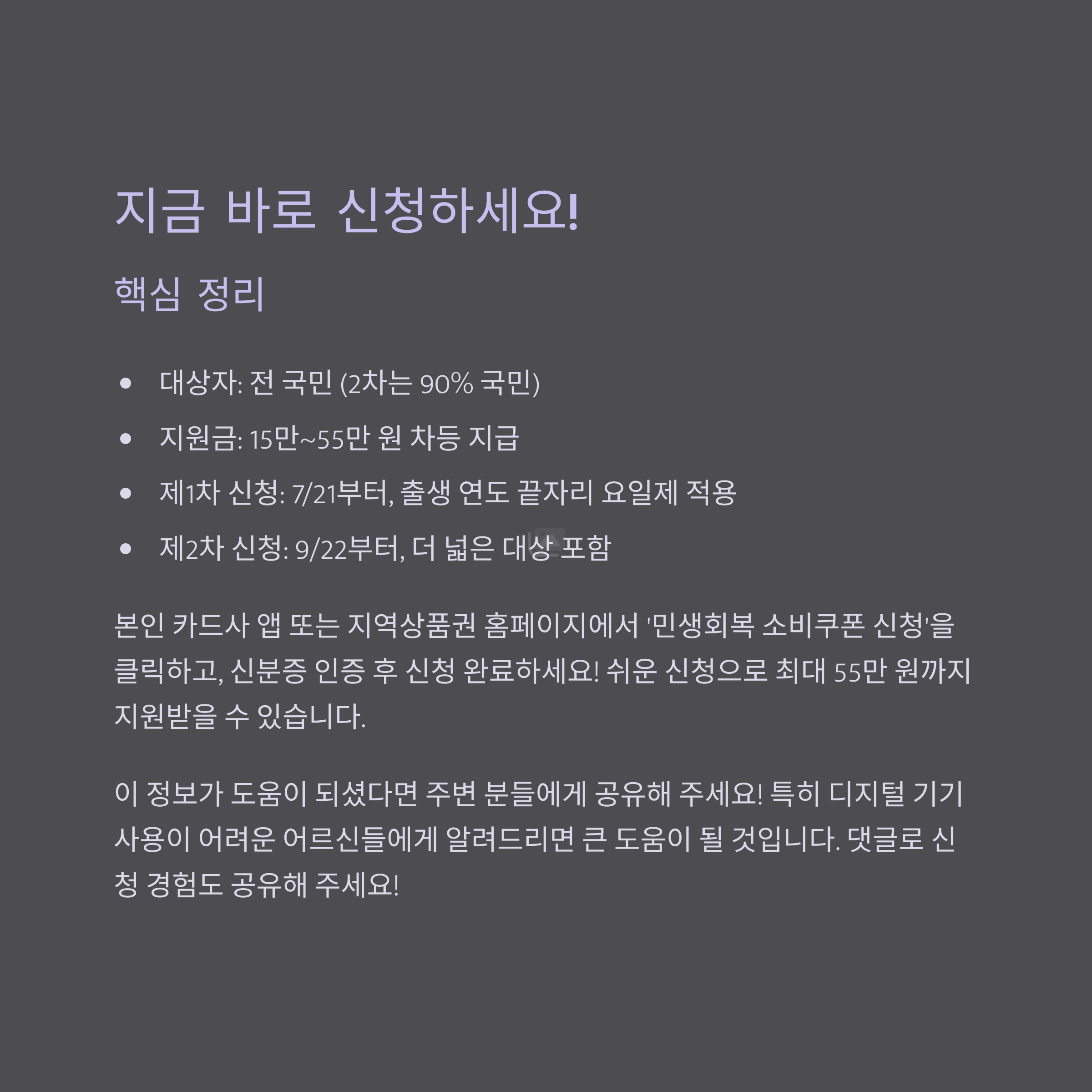 | 제1차 | 7/21~ | 전 국민 | 15만~55만 원 | 카드사·지역사랑상품권 |