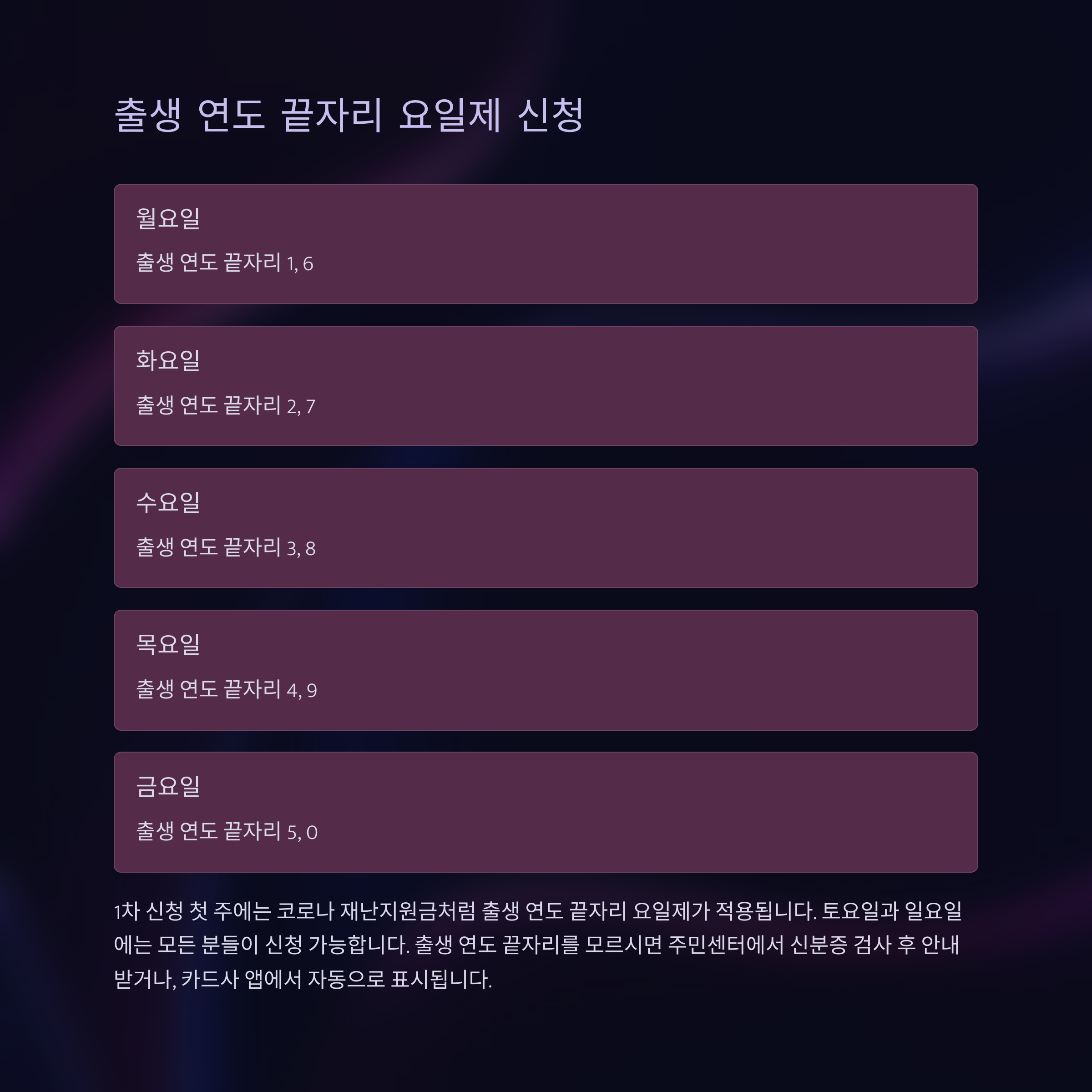 - 제1차 신청: 7/21부터, 출생 연도 끝자리 요일제 적용