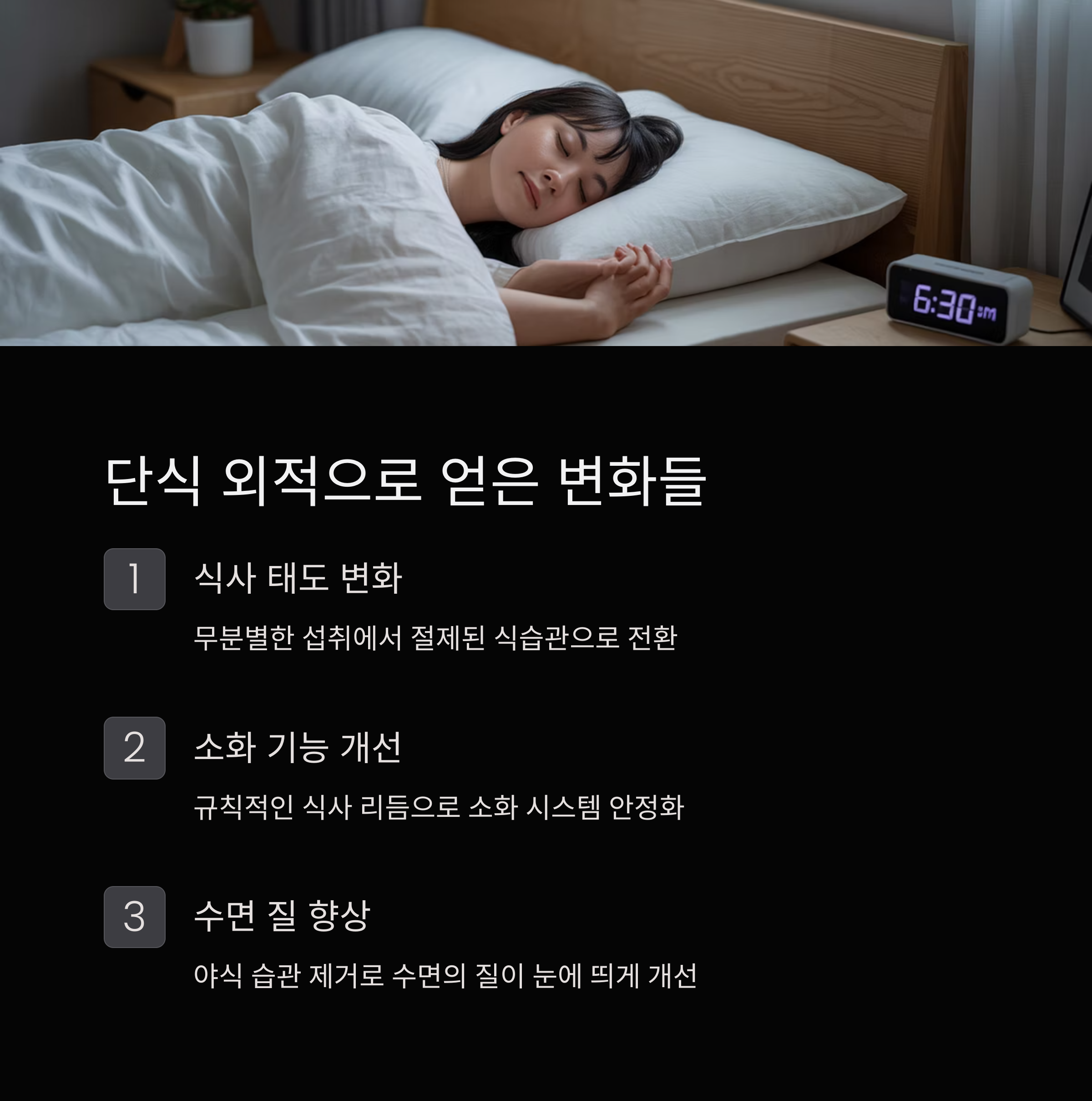 야식이 사라지며 수면 질도 눈에 띄게 향상됐습니다.