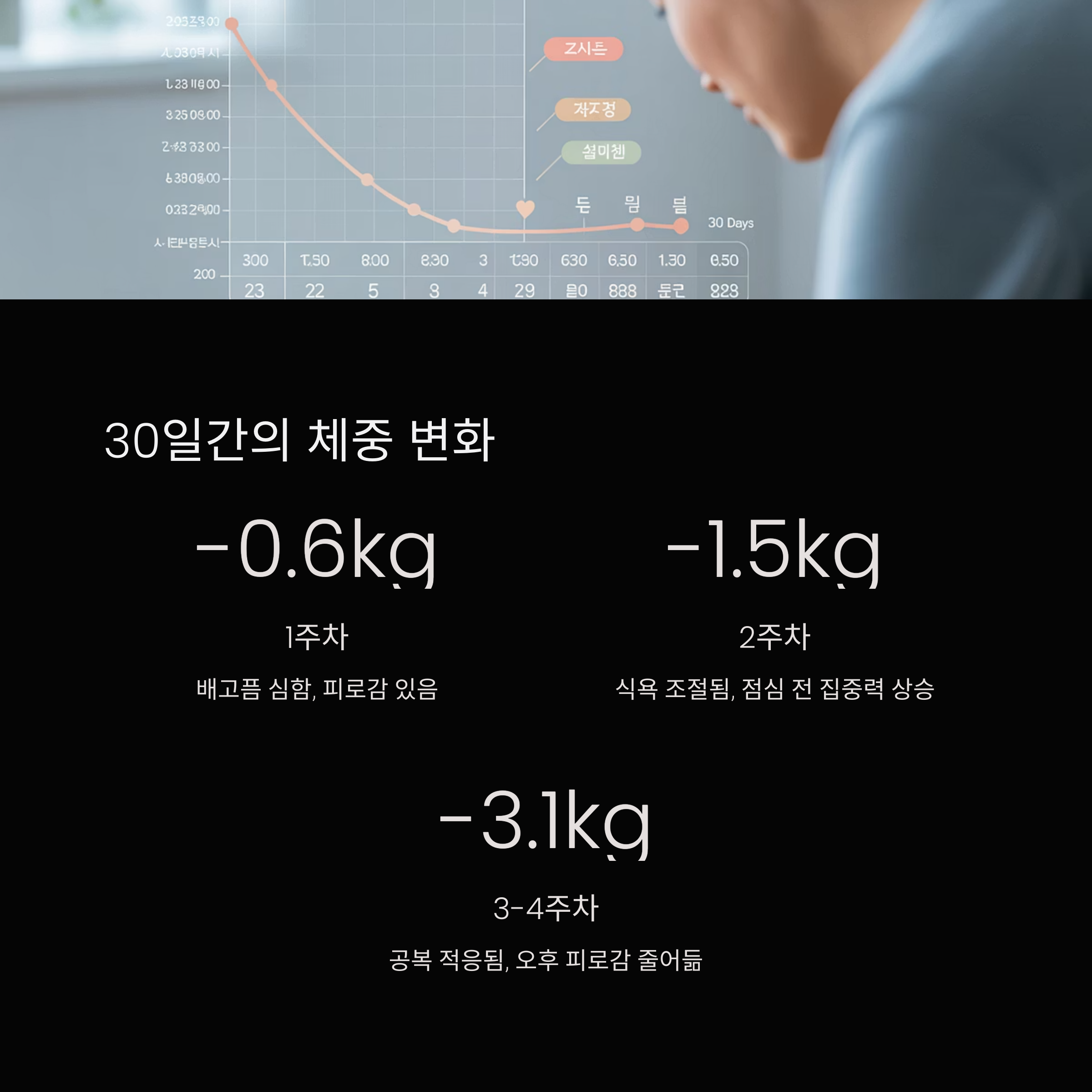 30일간 총 3kg 이상 감량되었고, 무엇보다 폭식 충동이