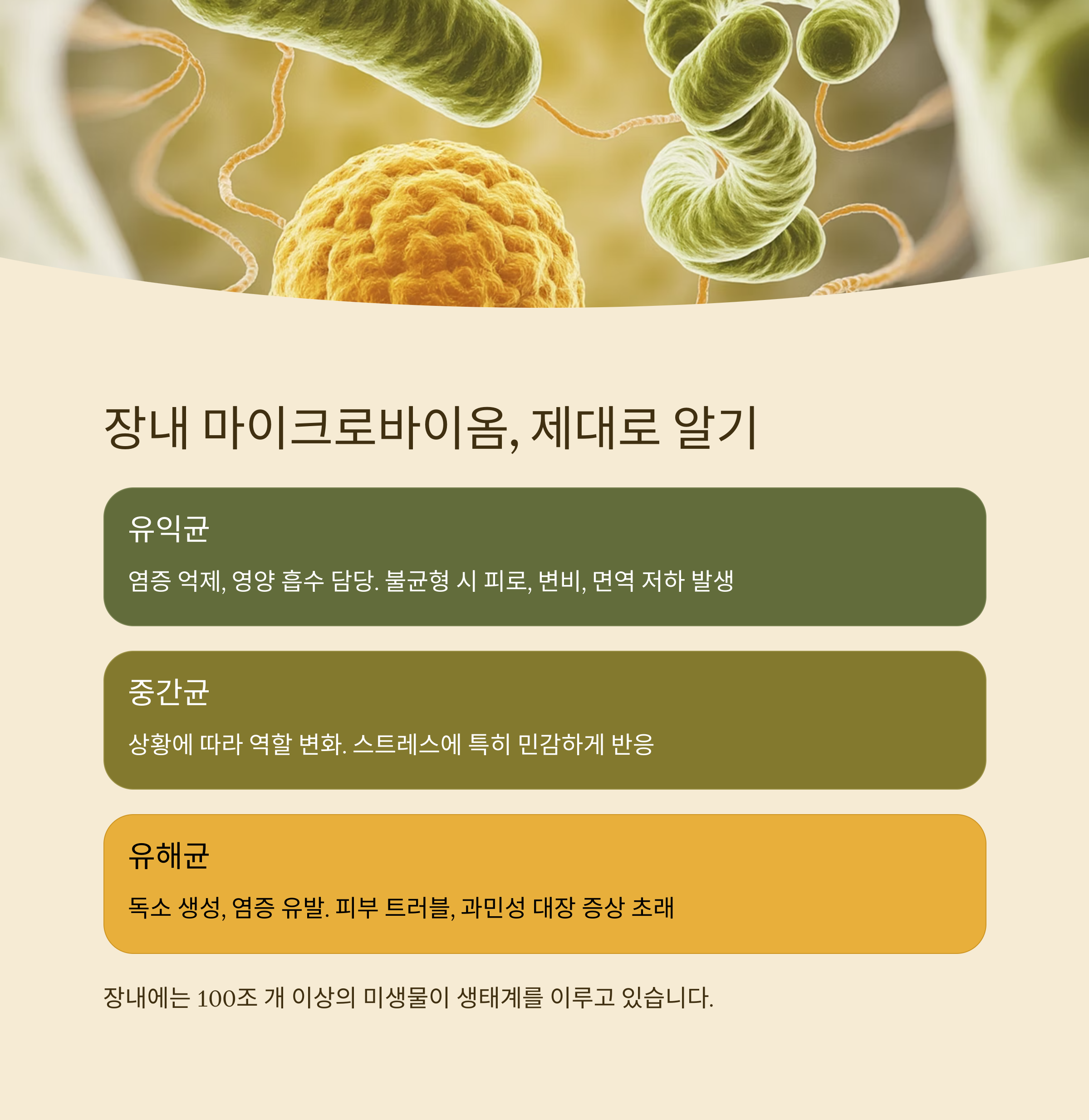 | 유익균 | 염증 억제, 영양 흡수 | 피로, 변비, 면역 저하 |