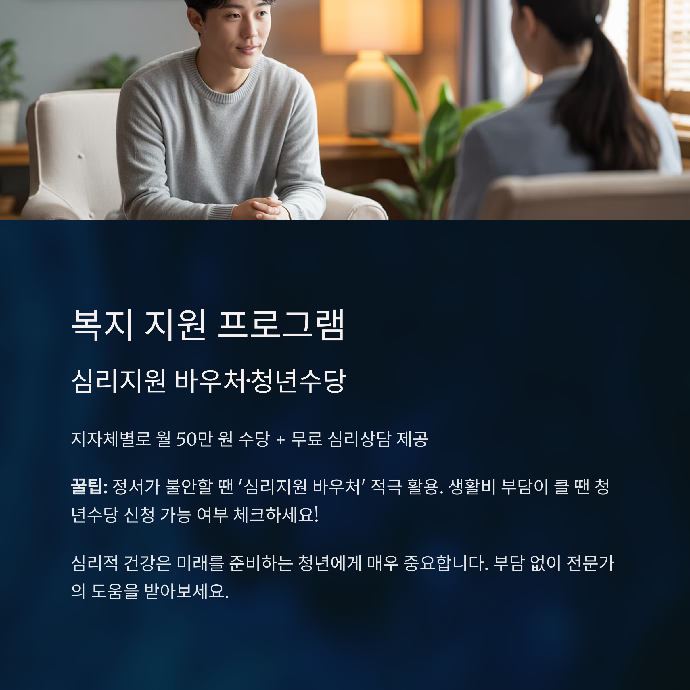 - 꿀팁: 정서가 불안할 땐 '심리지원 바우처' 적극 활용. 생활비 부담이 클 땐 청년수당 신청 가능 여부 체크!