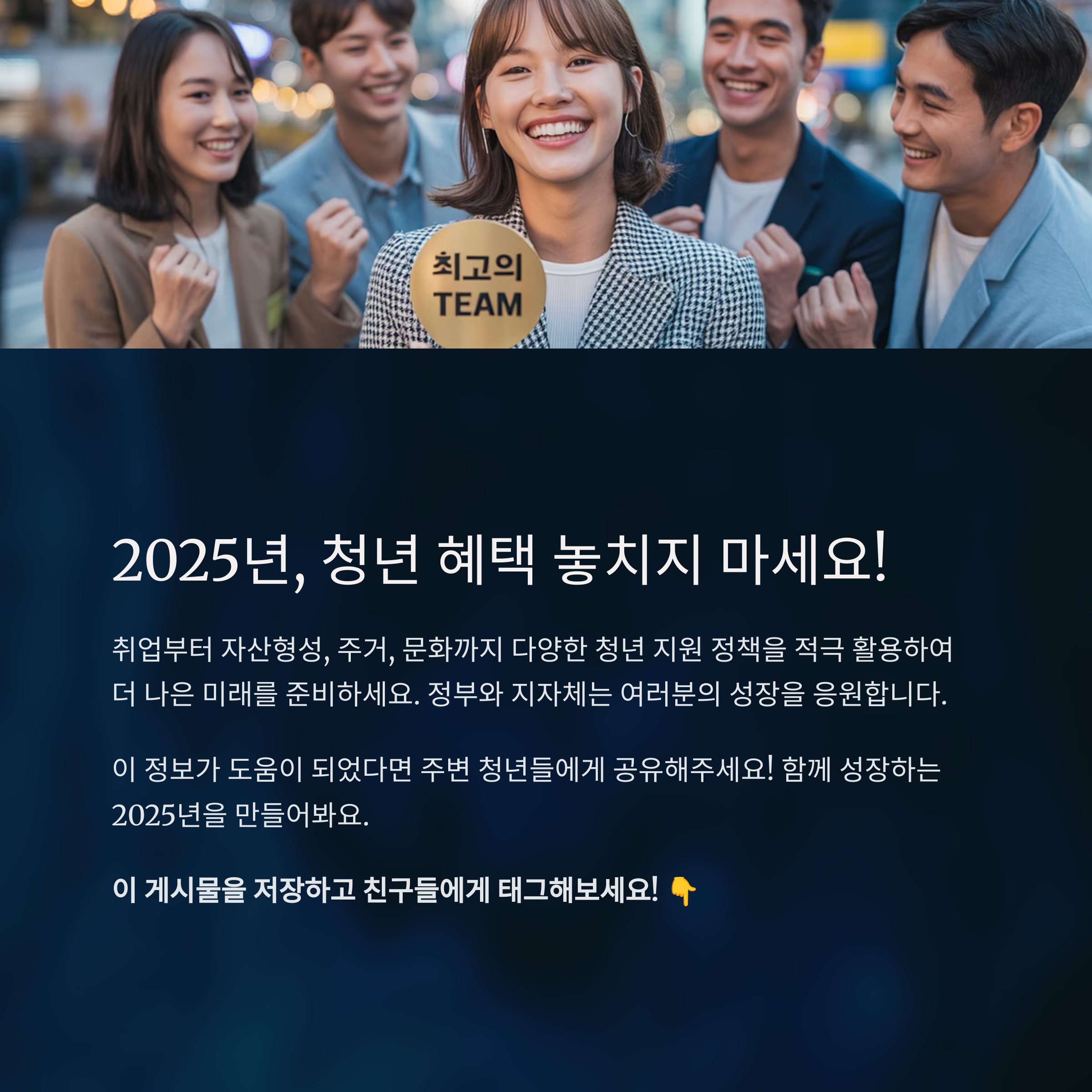 2025년을 맞아, 청년이라면 놓치지 말아야 할 정부·지자체 꿀팁을 분야별로 한눈에 정리했습니다. 취업, 자산 형성, 주거, 문화·교통, 복지 등 실속 있는 정보만 쏙쏙 뽑아봤어요.