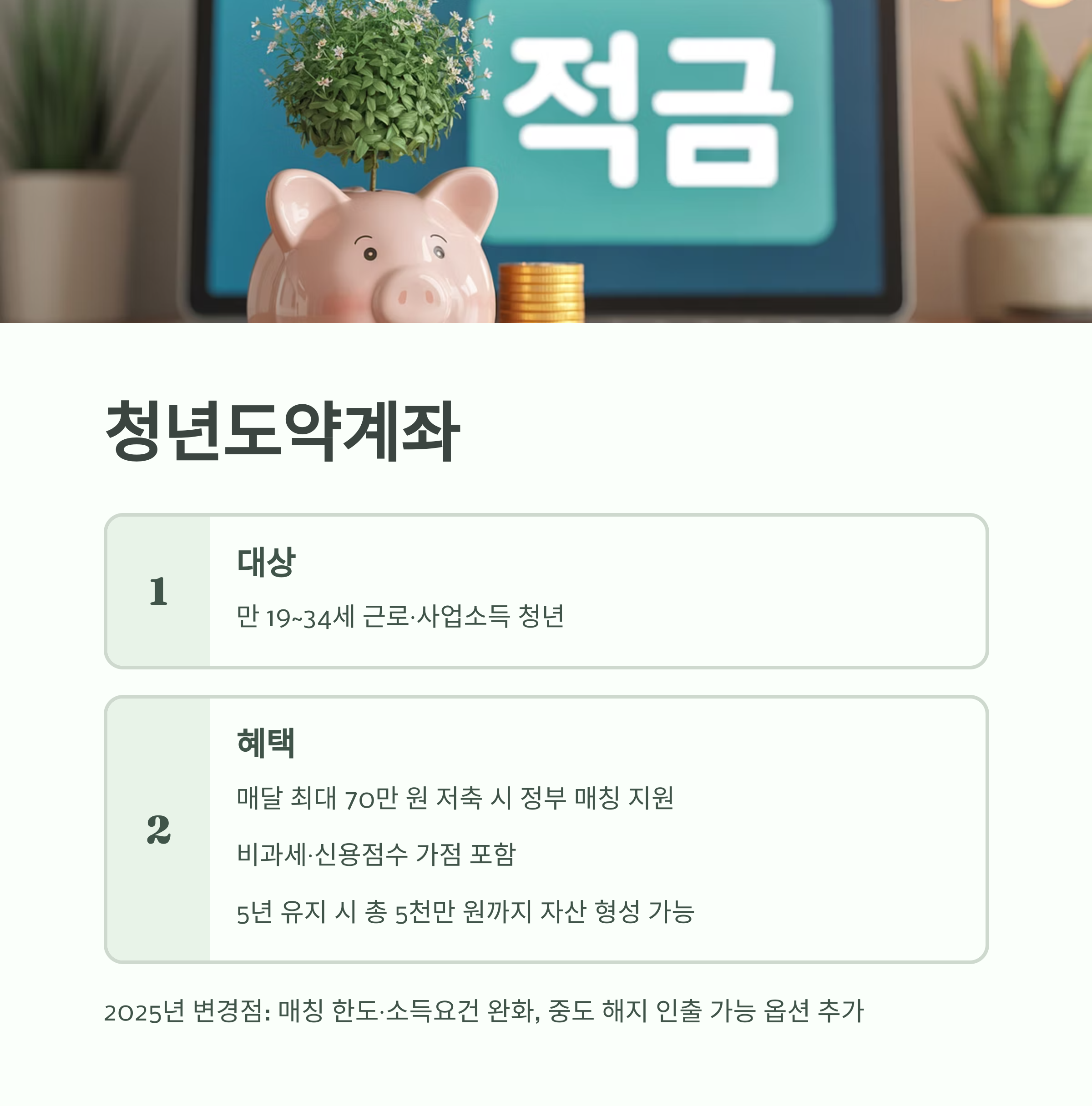 | 청년도약계좌 | 19~34세 근로 청년 | 월 최대 70만 원 저축, 정부 매칭, 비과세·신용가점 | 매칭한도 및 조건 완화, 인출 가능 |