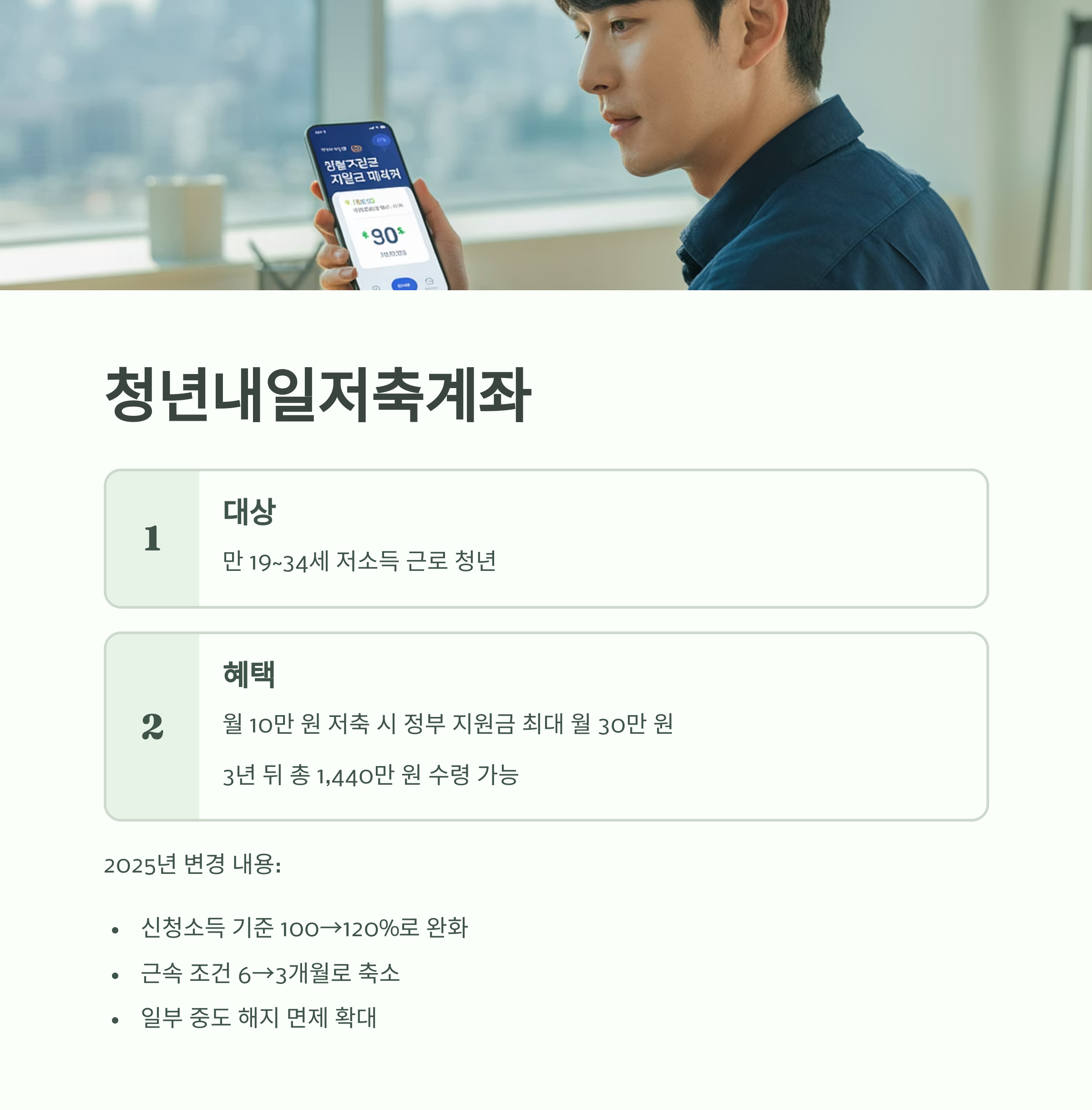 | 청년내일저축계좌 | 19~34세 저소득 청년 | 월 10만 + 지원금 30만, 총 1,440만 원 | 소득 기준 완화, 중도 해지 면제 확대 |