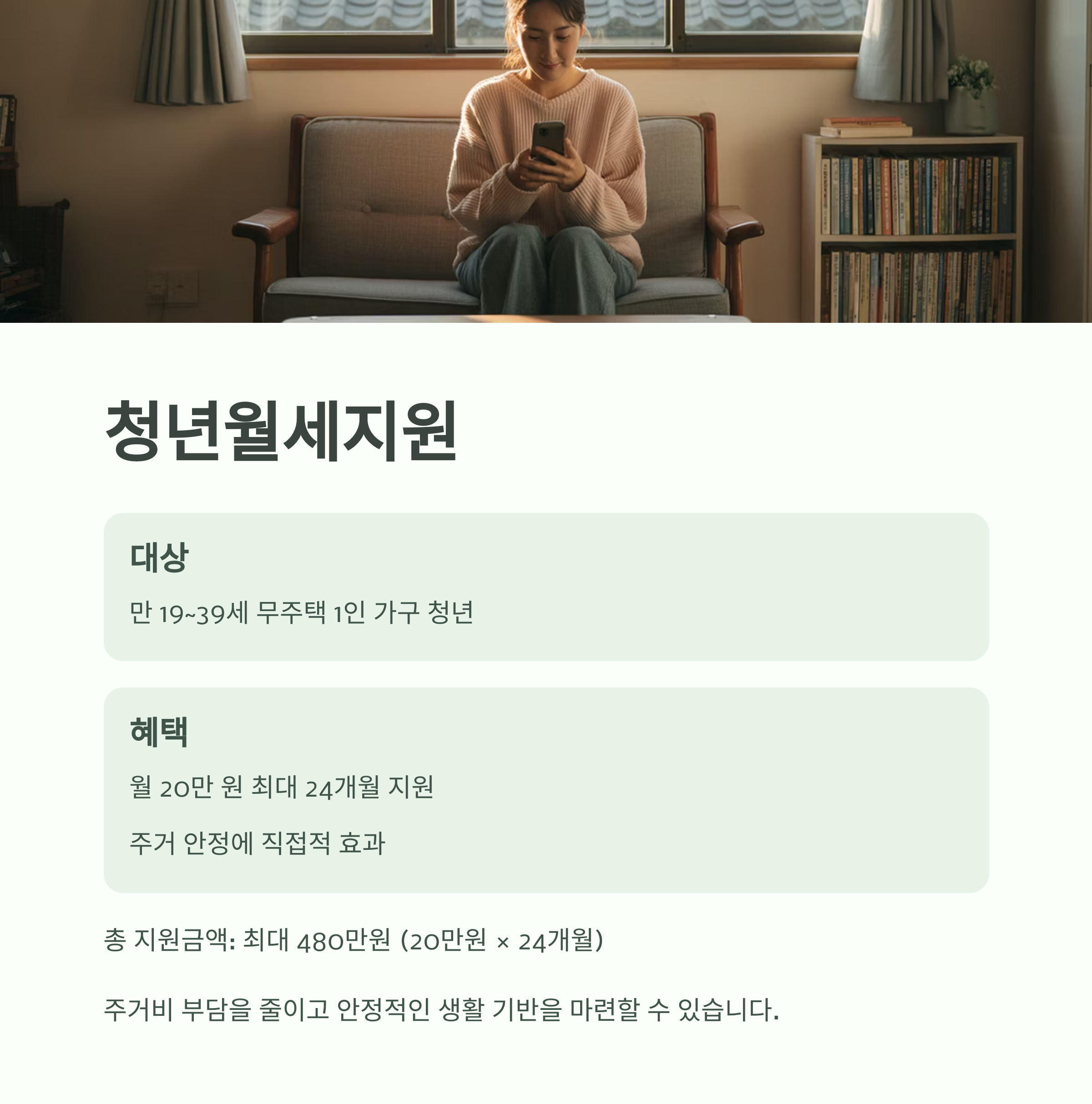 | 청년월세지원 | 19~39세 무주택 | 월세 최대 20만 원 × 24개월 | 주거 부담 완화 지원 |