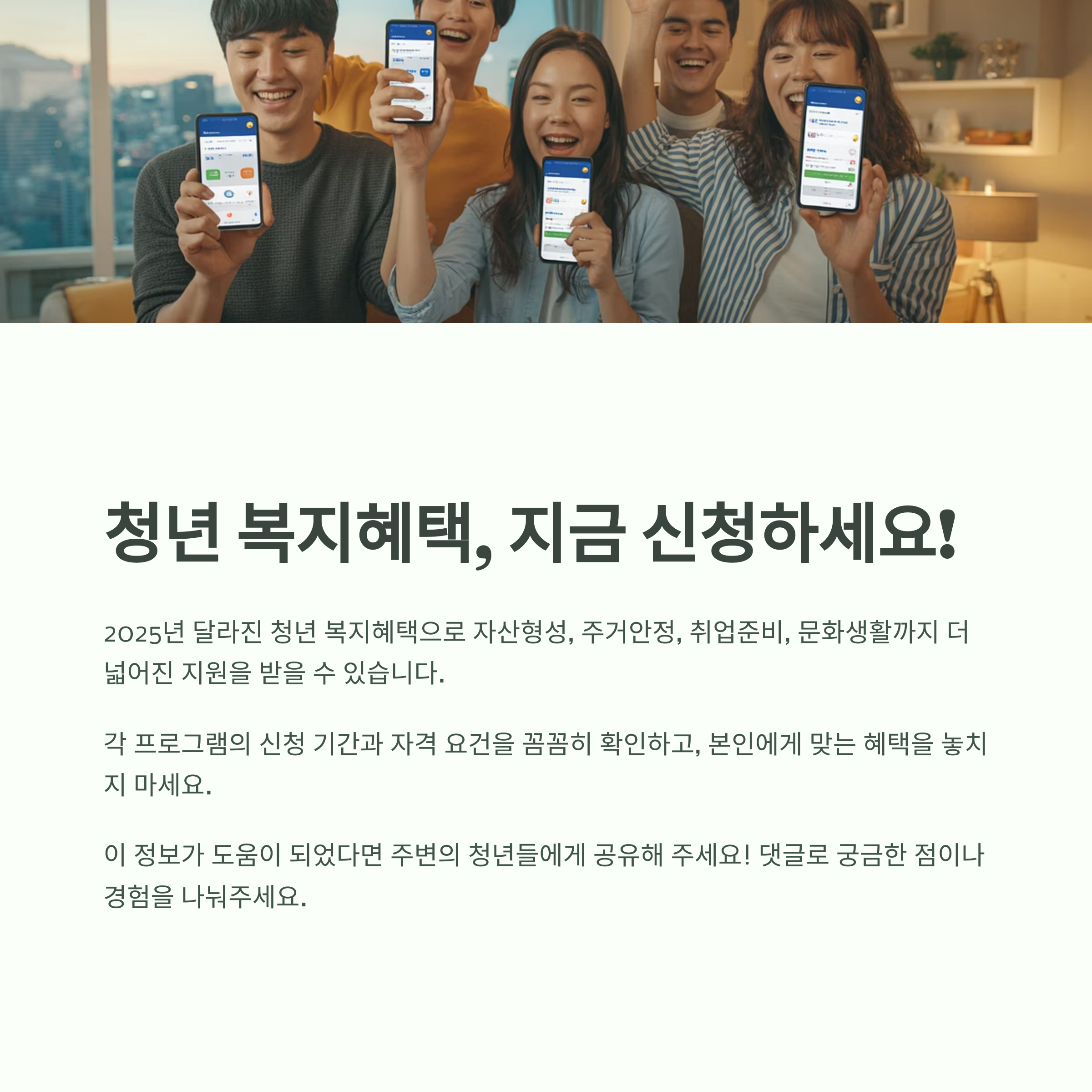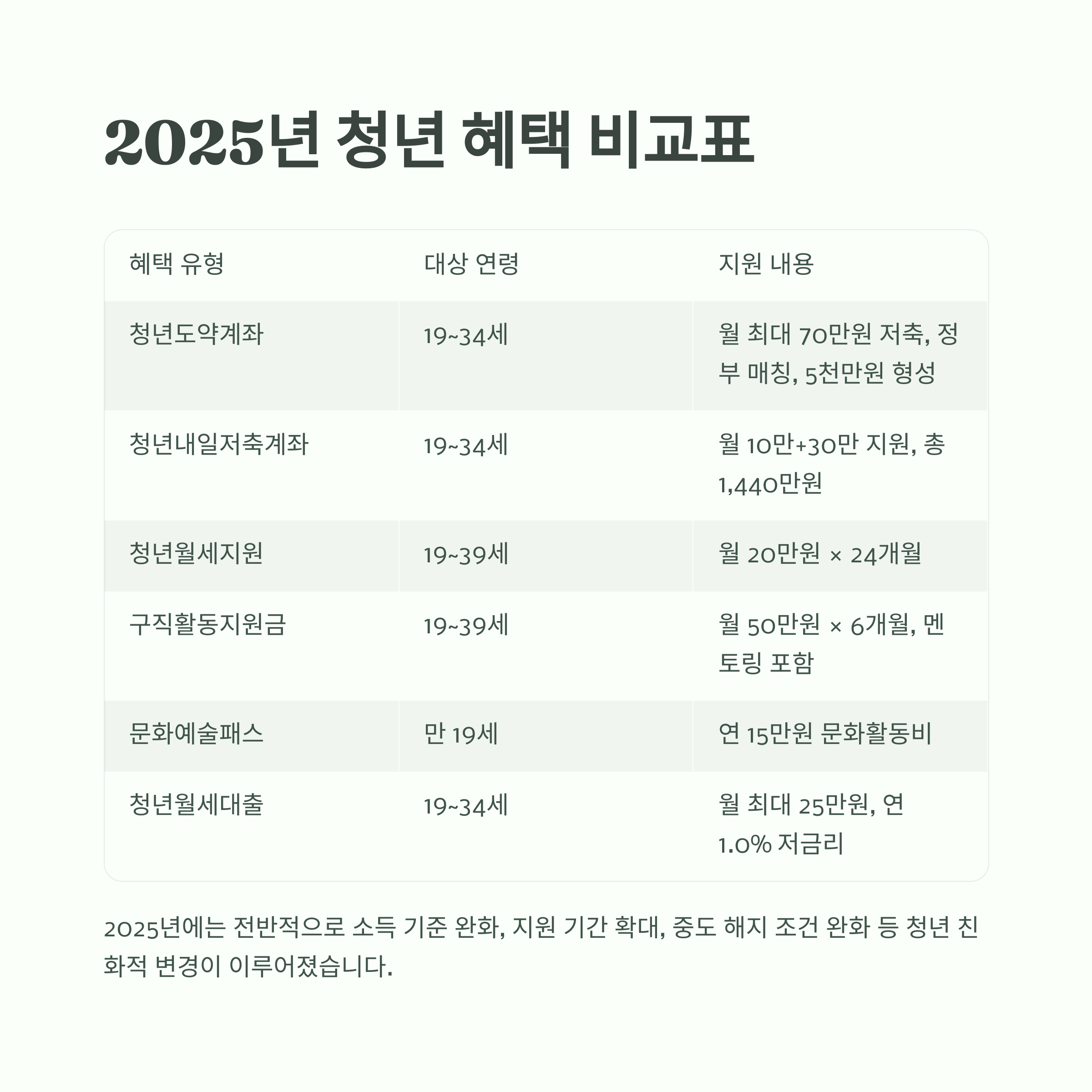 2025년 청년이 누릴 수 있는 취업·주거·금융·자산형성·문화·복지 혜택을 한눈에 비교할 수 있도록 정리했습니다.