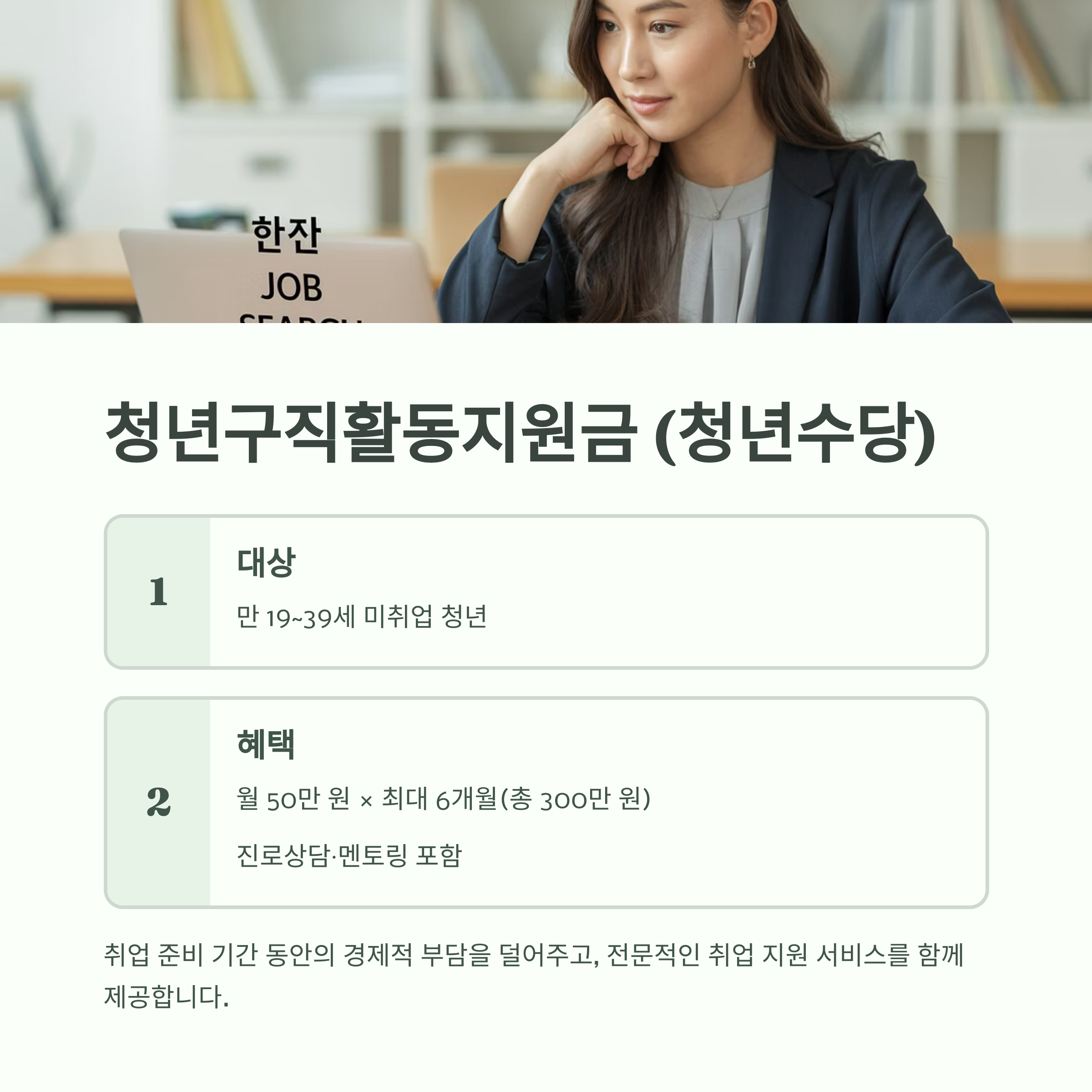 | 구직활동지원금 | 19~39세 미취업 청년 | 월 50만 원 × 6개월 | 멘토링·심리 프로그램 포함 |
