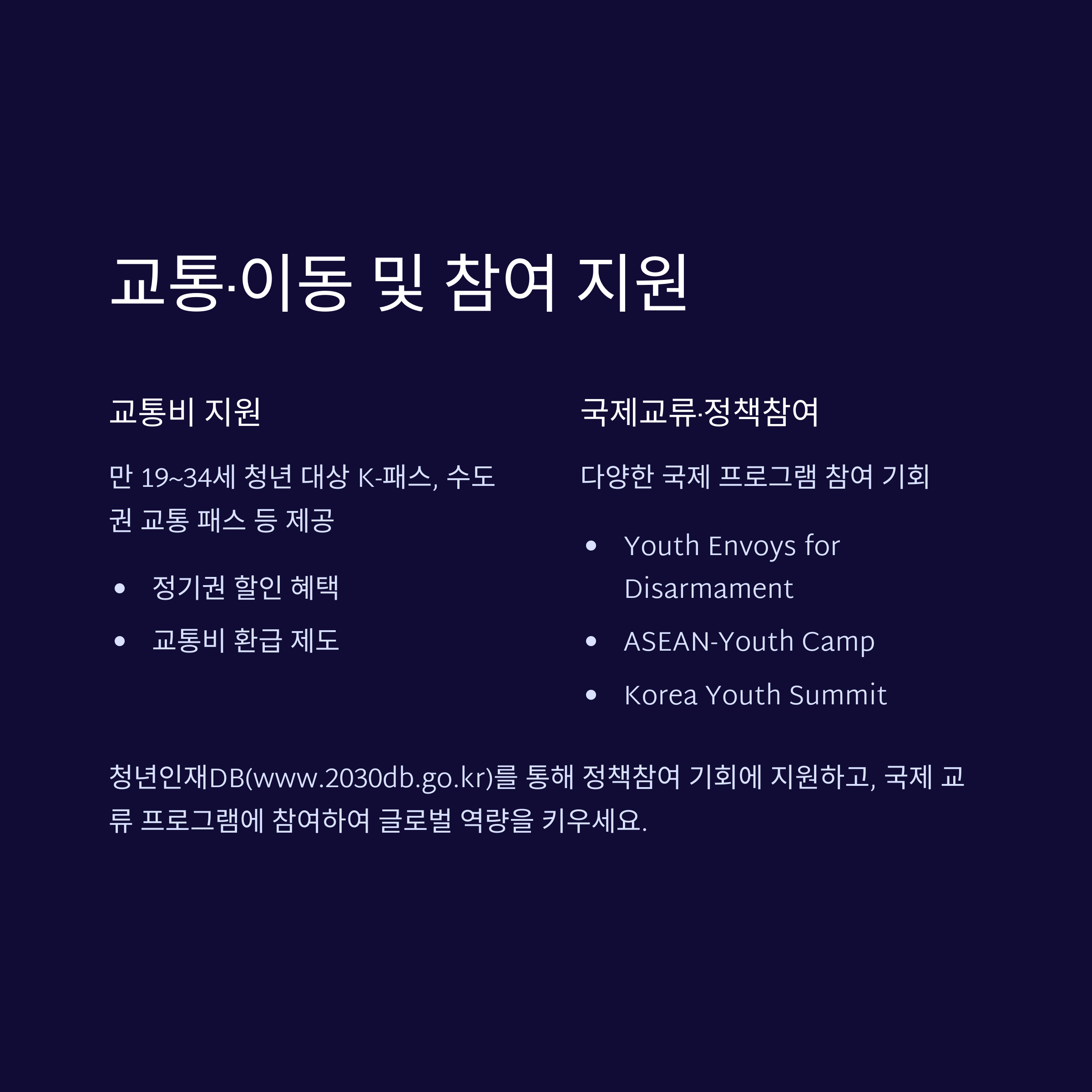 | 교통 | 대중교통 정기권 할인·환급 (K-패스 등) |