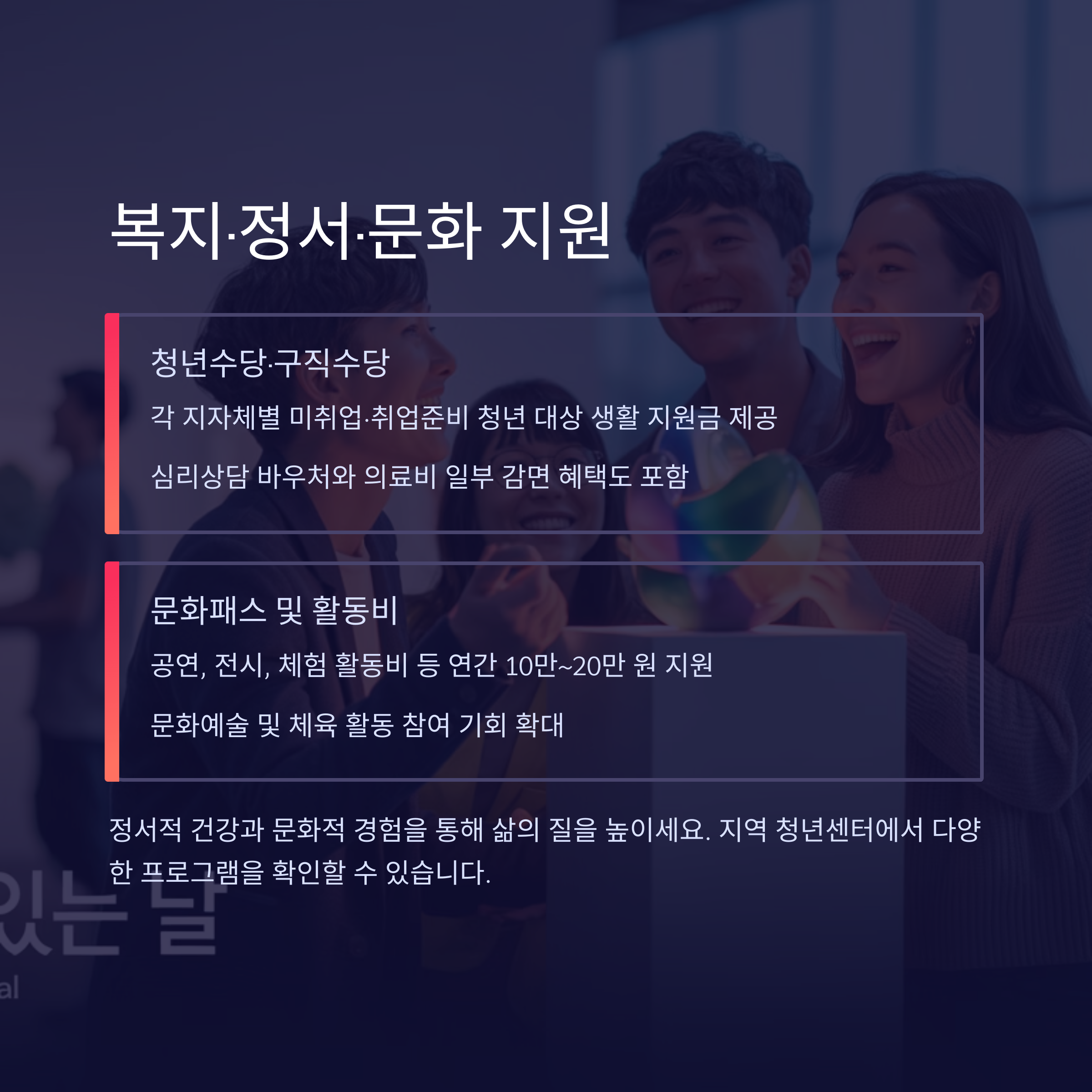 | 복지·정서 | 청년수당, 심리지원 바우처, 문화·예술·스포츠 지원 |