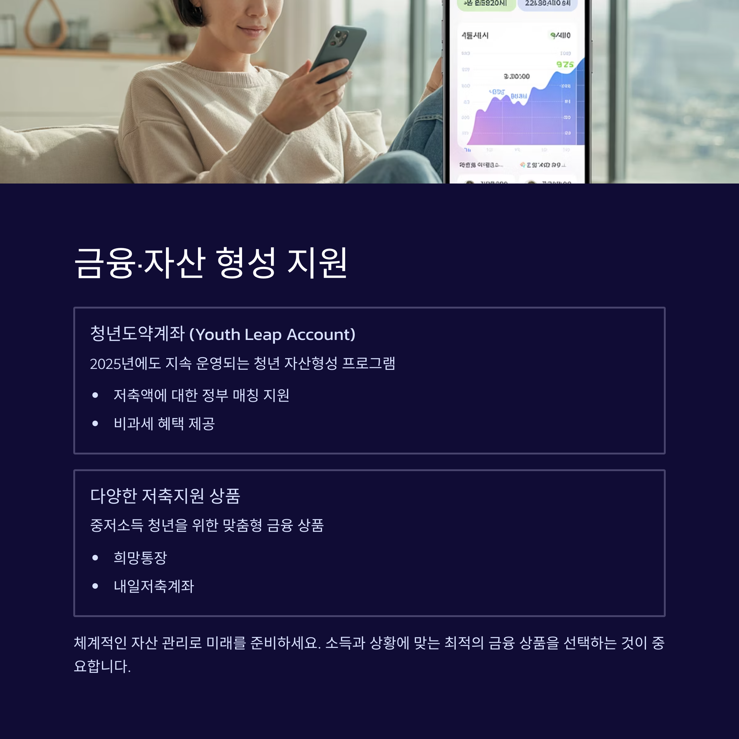 | 금융 | 청년도약계좌, 희망통장·내일저축계좌 등 자산형성 상품 |