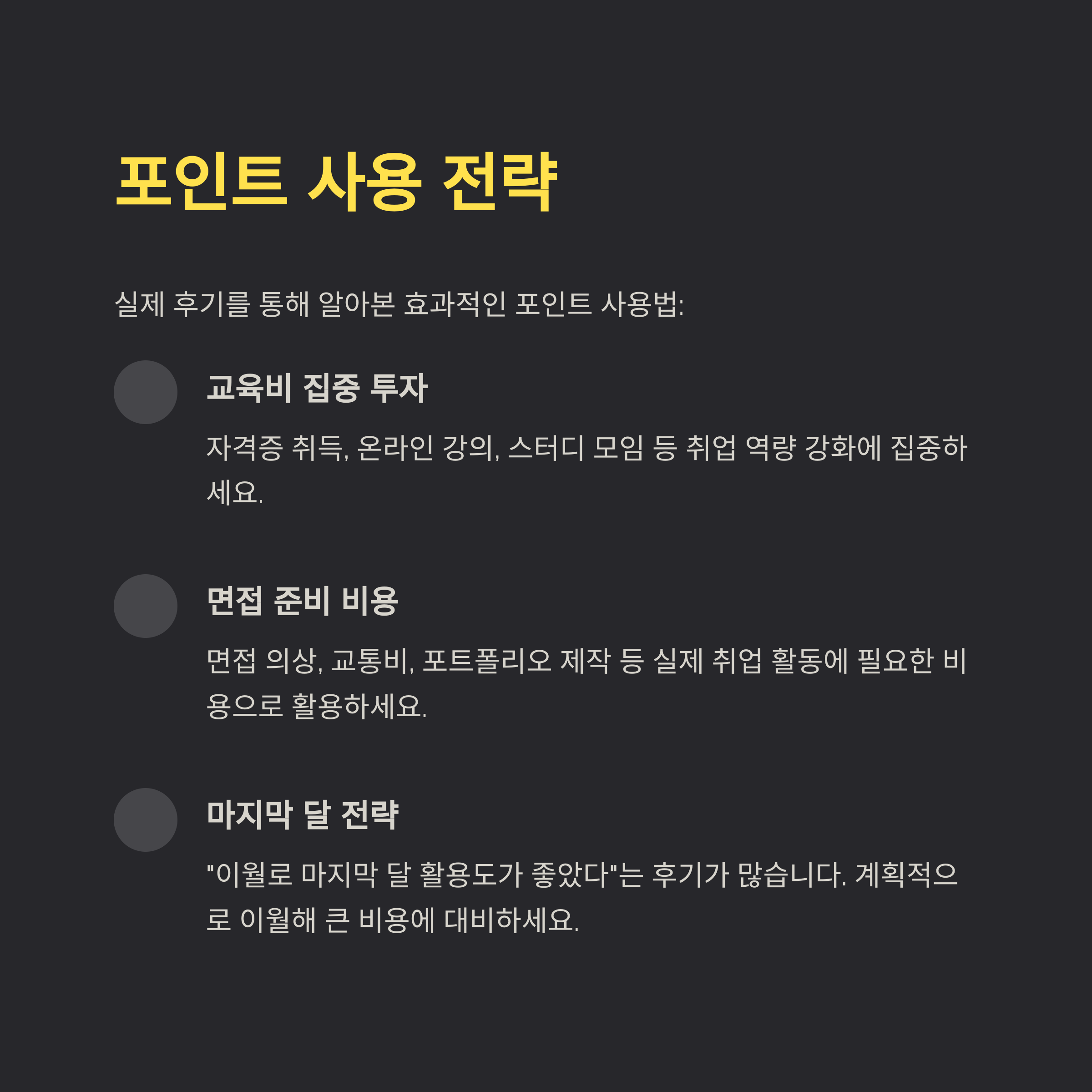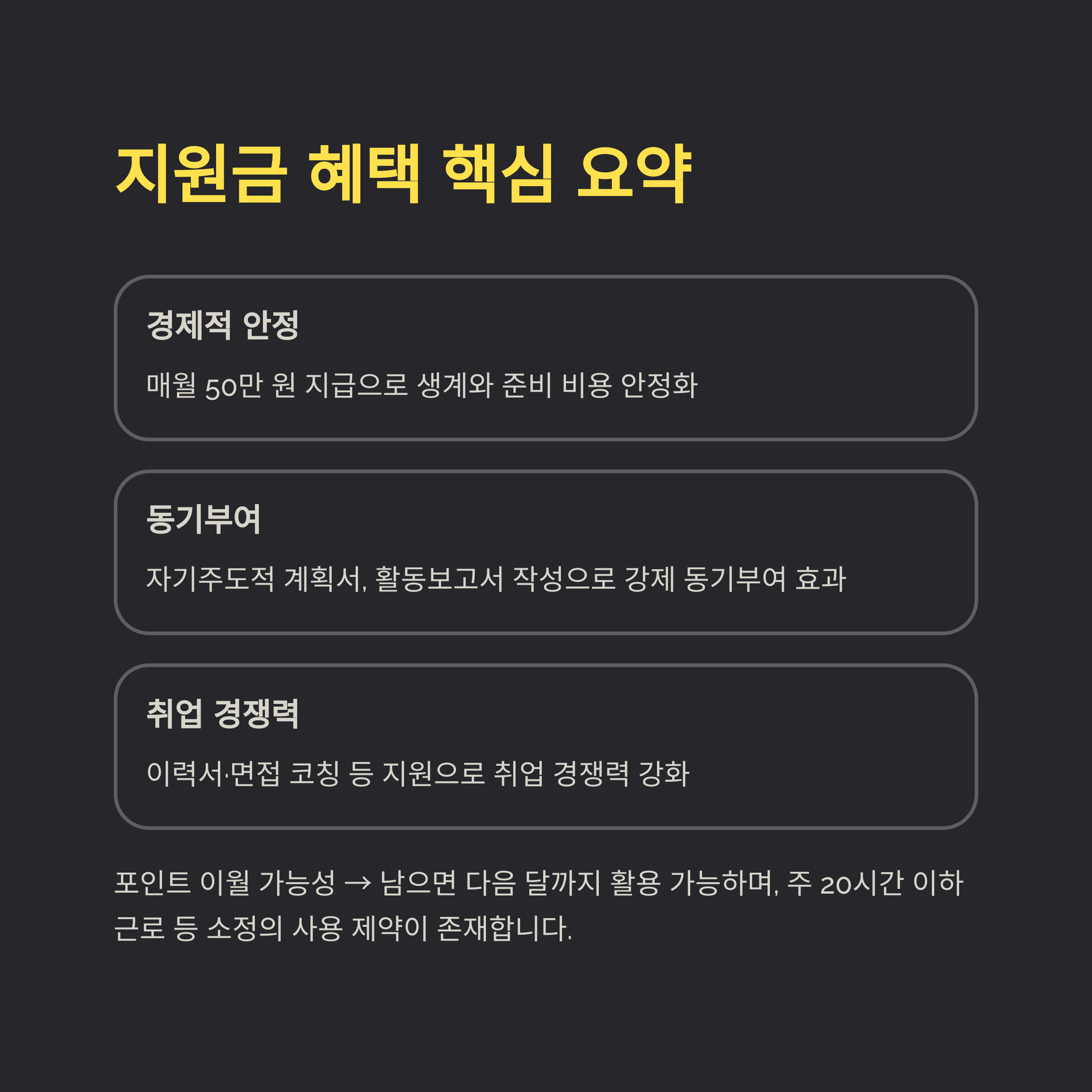 | 포인트 사용 팁 | 교육, 자격증, 교통비 등 취업 관련 비용에 집중 |