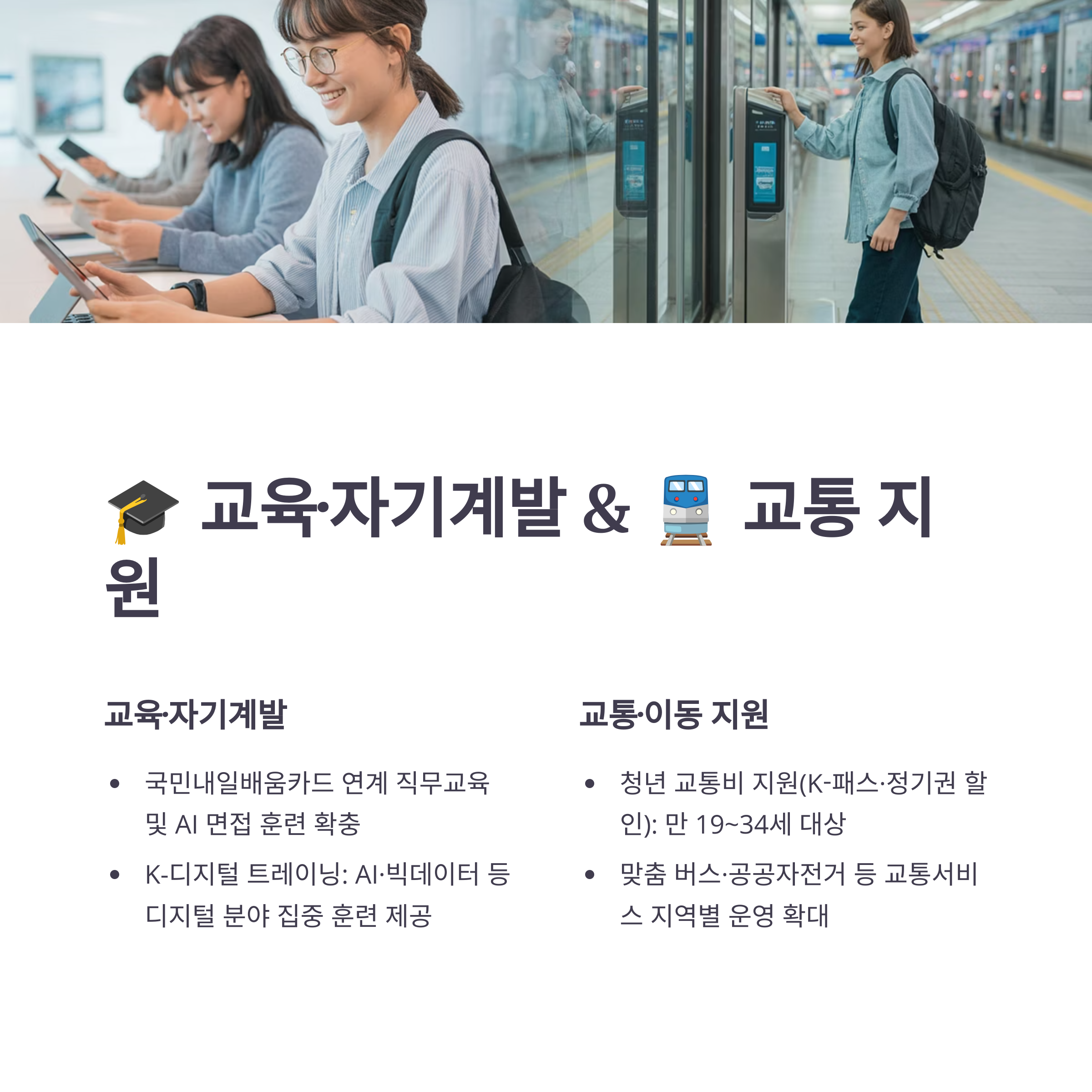 | 교육·훈련 | 내일배움카드, 디지털훈련 | 모든 청년 | 직무교육, AI 훈련, K-디지털 |