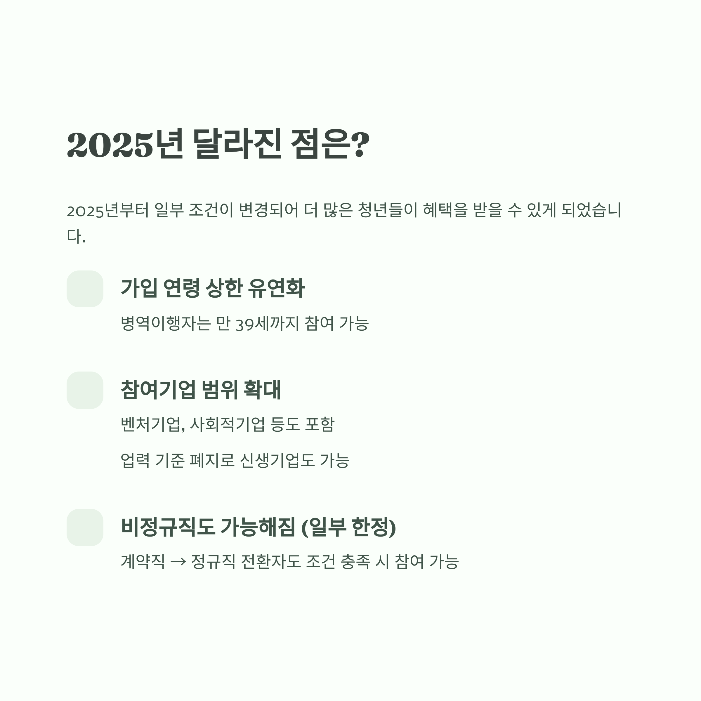 2025년부터 일부 조건이 변경되었고, 더 많은 청년이 참여할 수 있도록 완화된 기준이 적용되고 있어요.