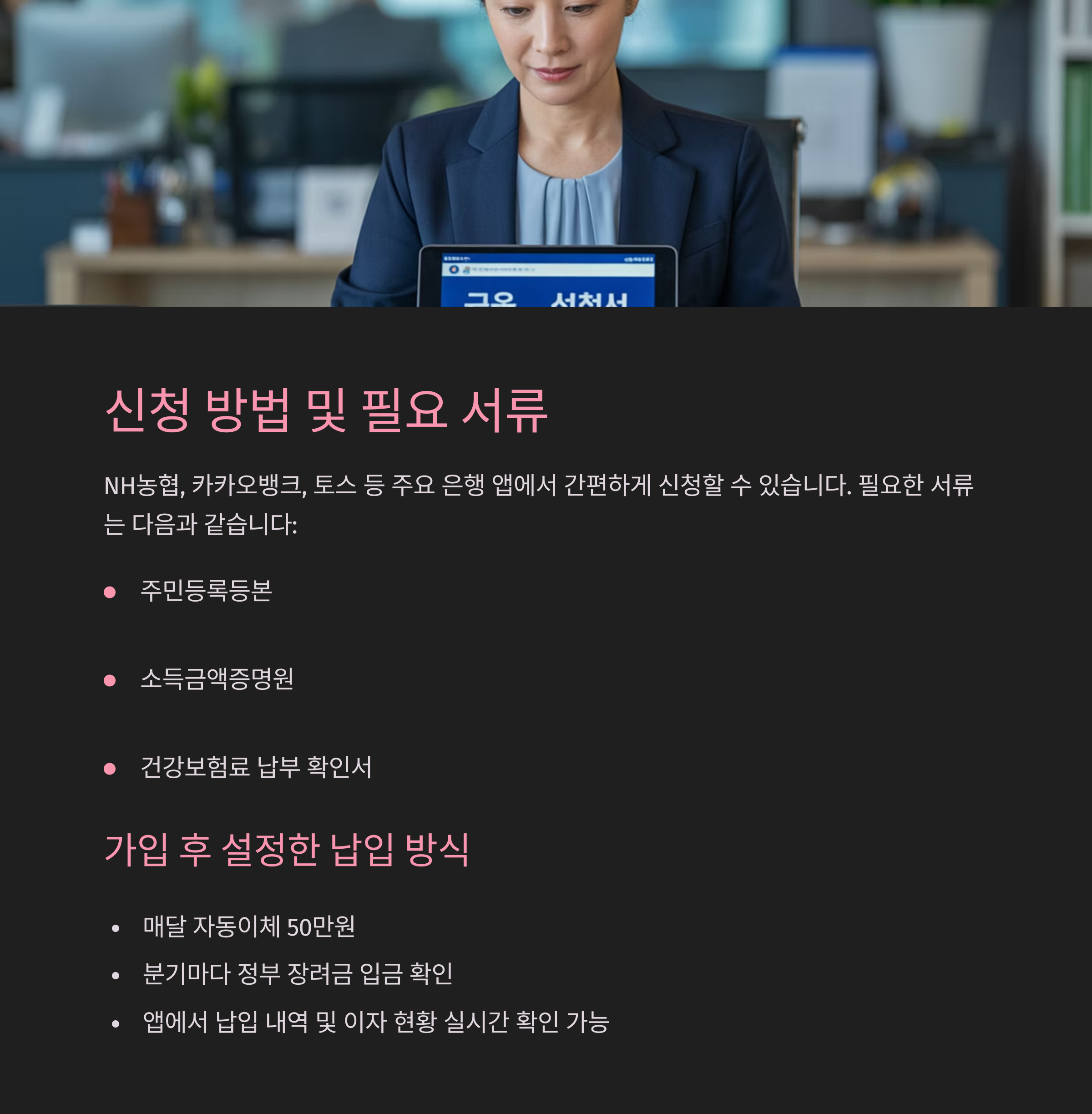 : 매월 유동적으로 금액을 조절할 수 있어 부담이 적습니다. - 비대면 신청 가능