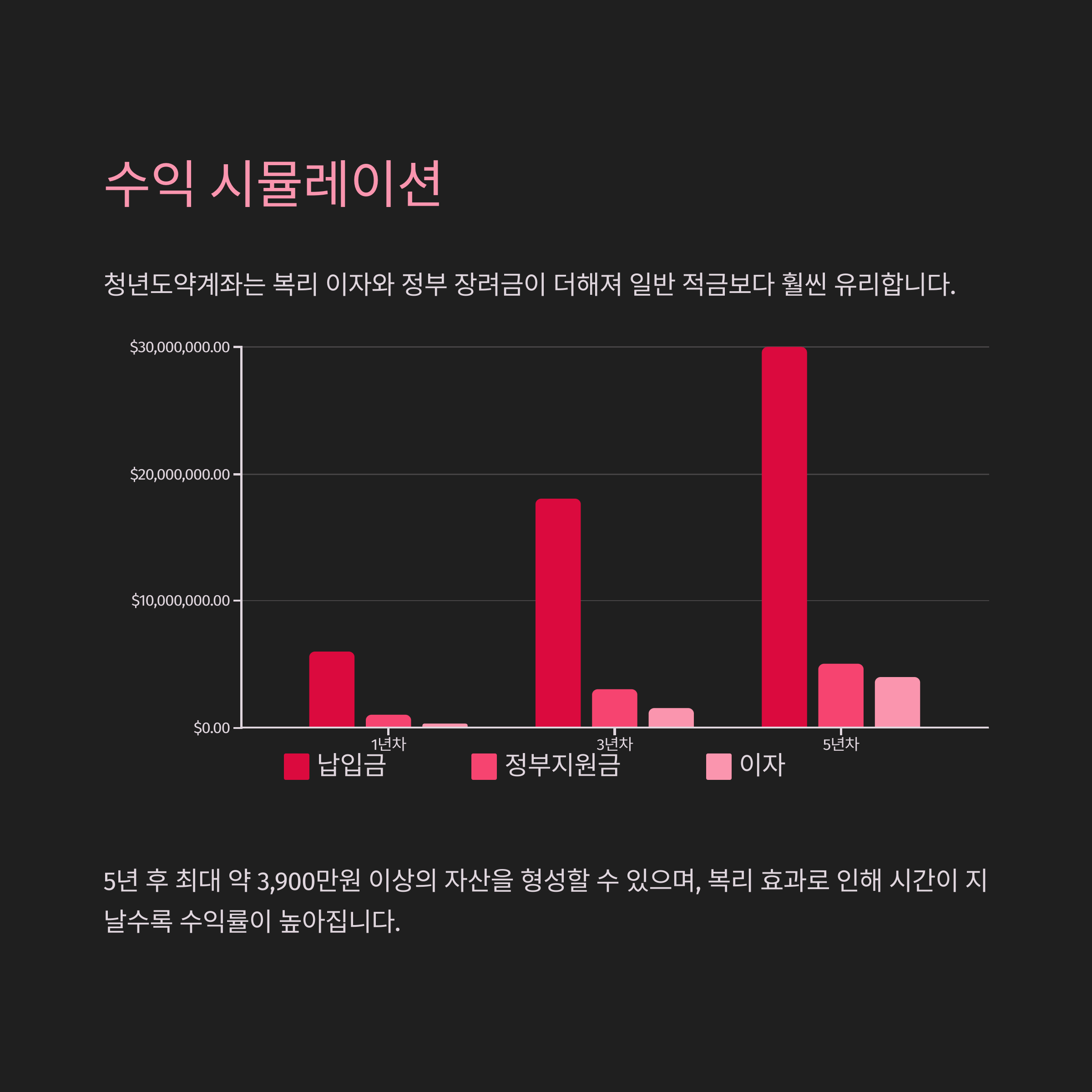| 5년차 | 3,000만 원 | 약 500만 원 | 400만 원 | 약 3,900만 원 이상 |
