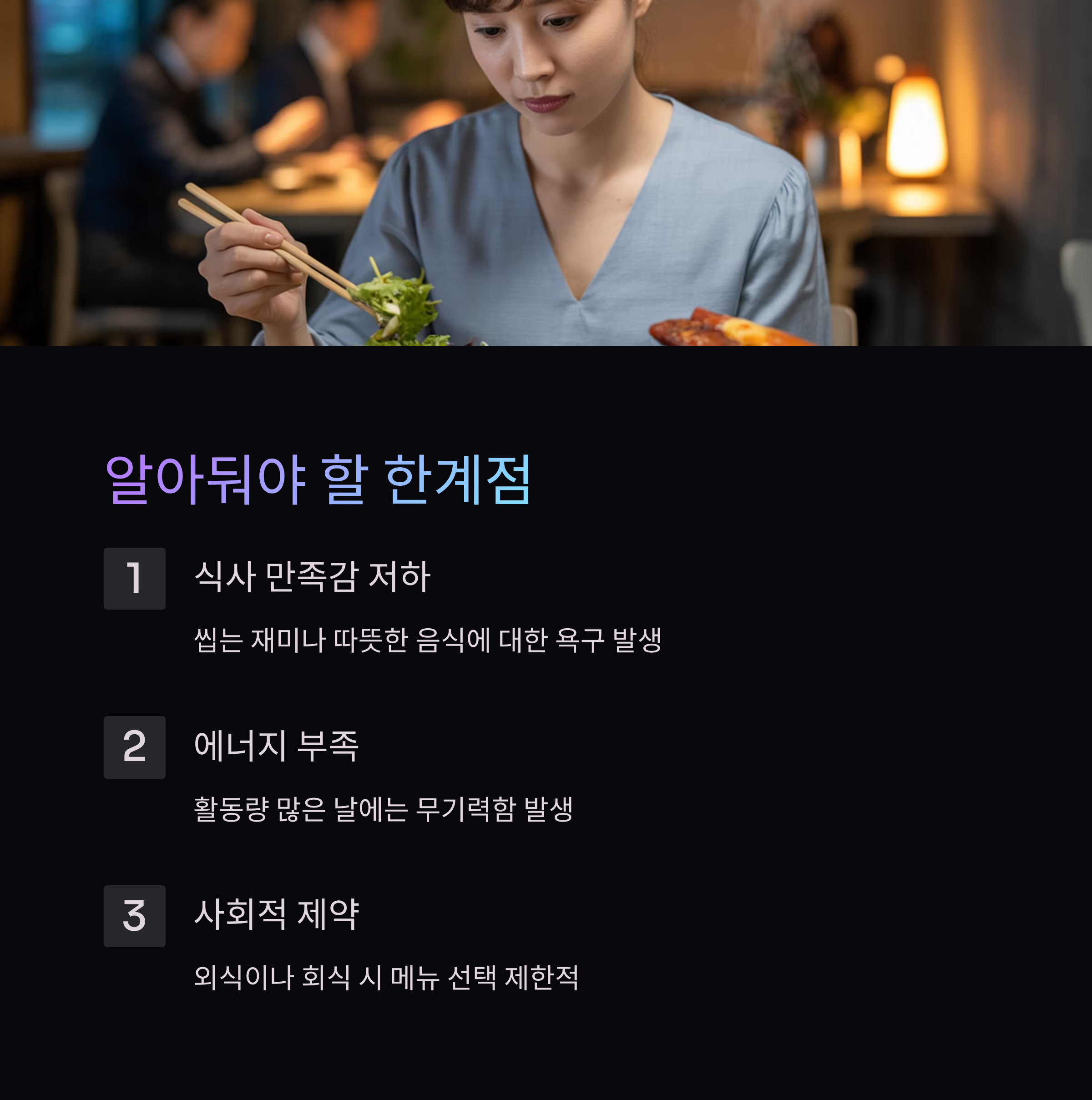 | 식욕 조절 | 첫 3일 배고픔 심했으나 이후 포만감으로 안정됨 |
