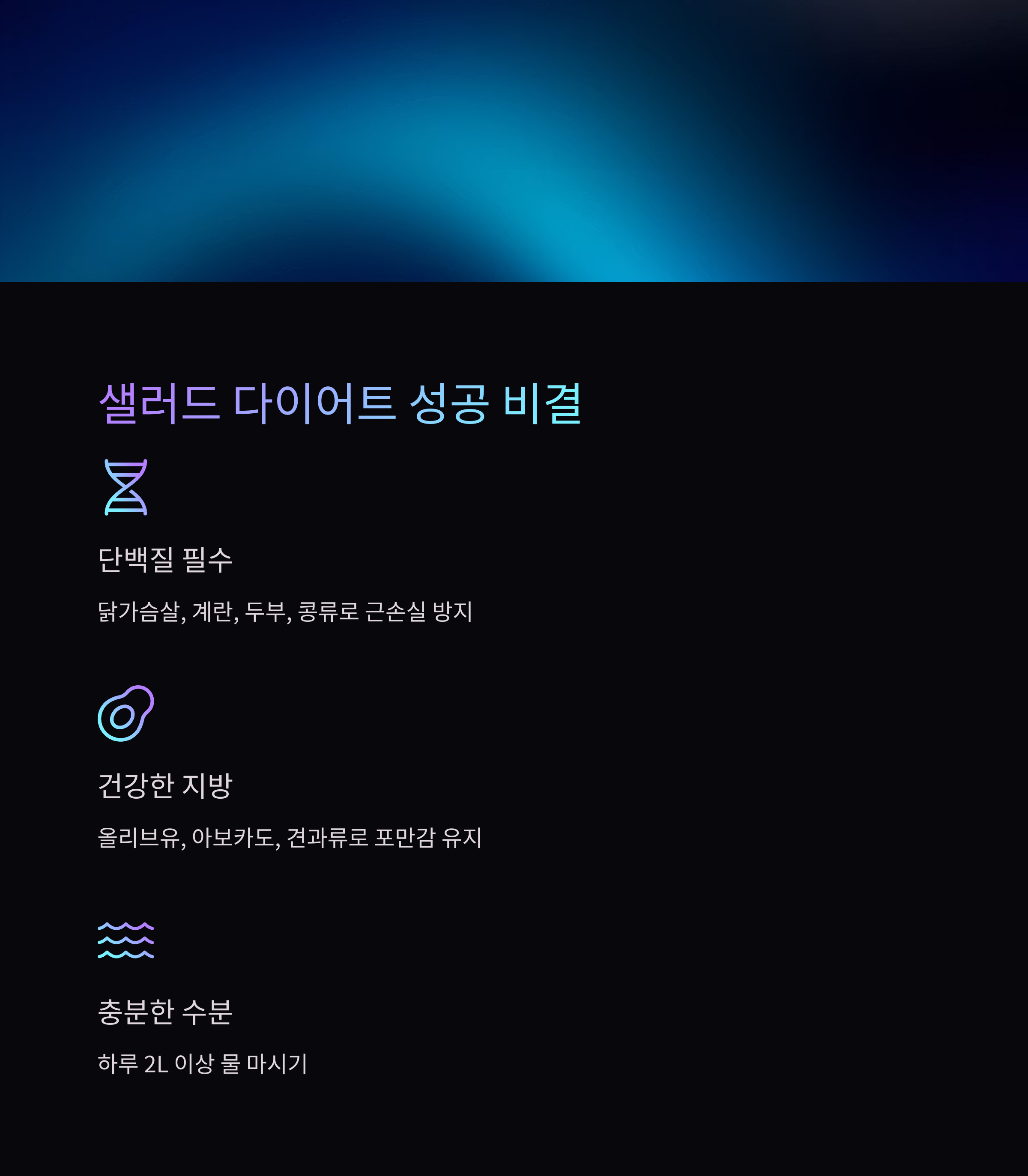 | 월 | 닭가슴살 샐러드 + 삶은 달걀 1개 | 연어 샐러드 + 현미밥 1/2공기 | 두부 샐러드 + 아보카도 + 오이 |