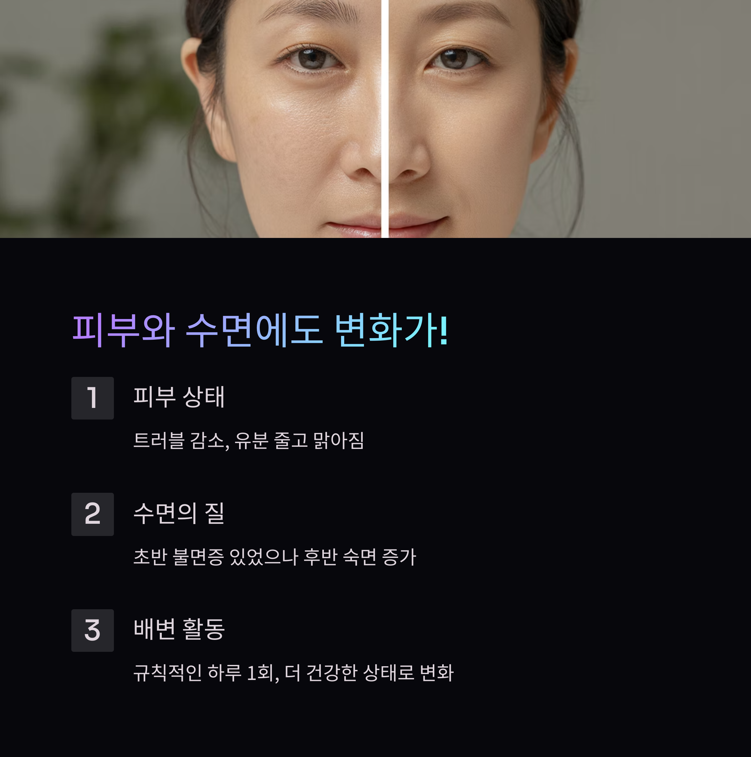 | 피부 상태 | 트러블 감소, 유분 줄고 맑아짐 |