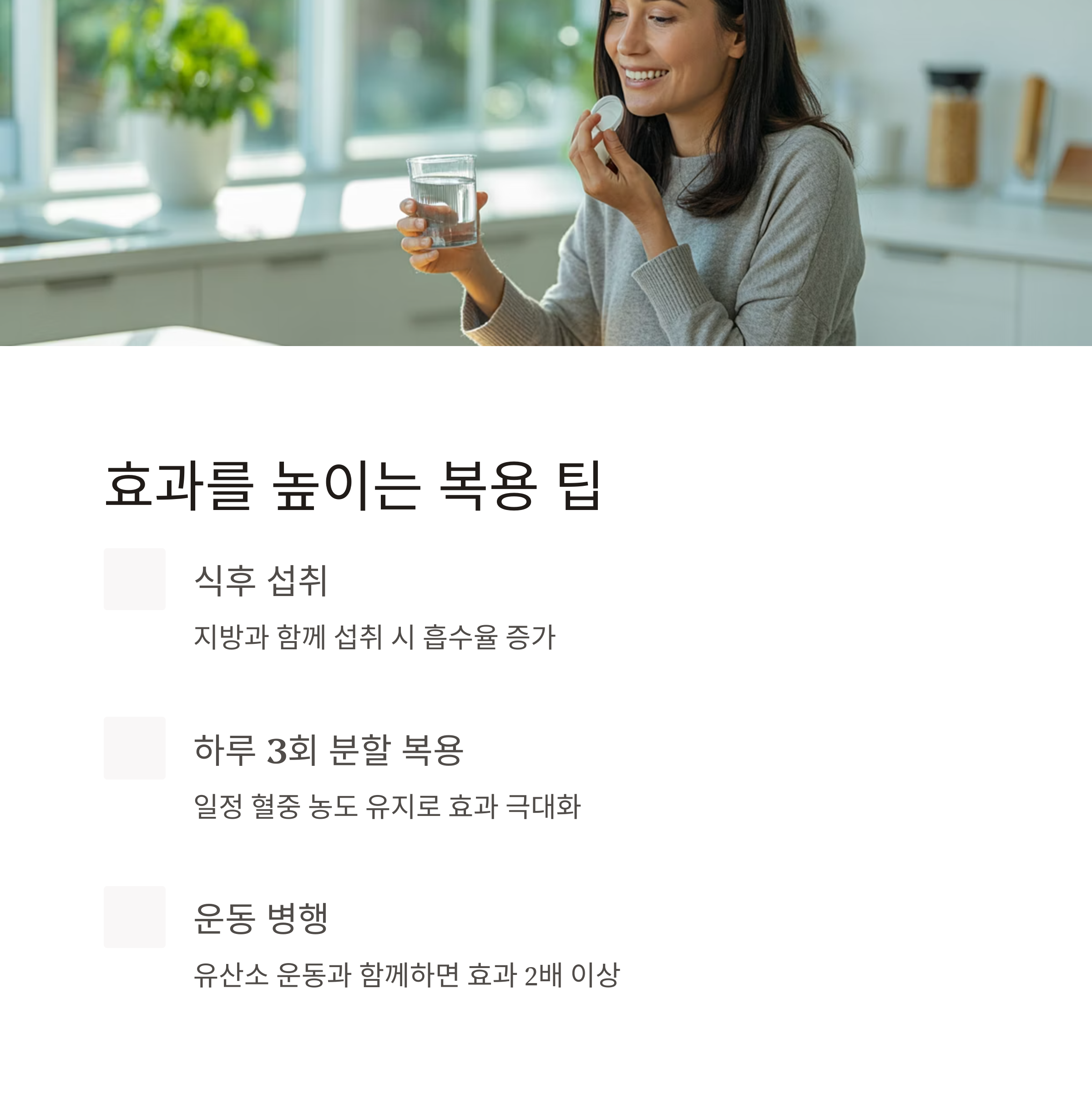 | 식후 섭취 권장 | 지방과 함께 섭취 시 흡수율 증가 |