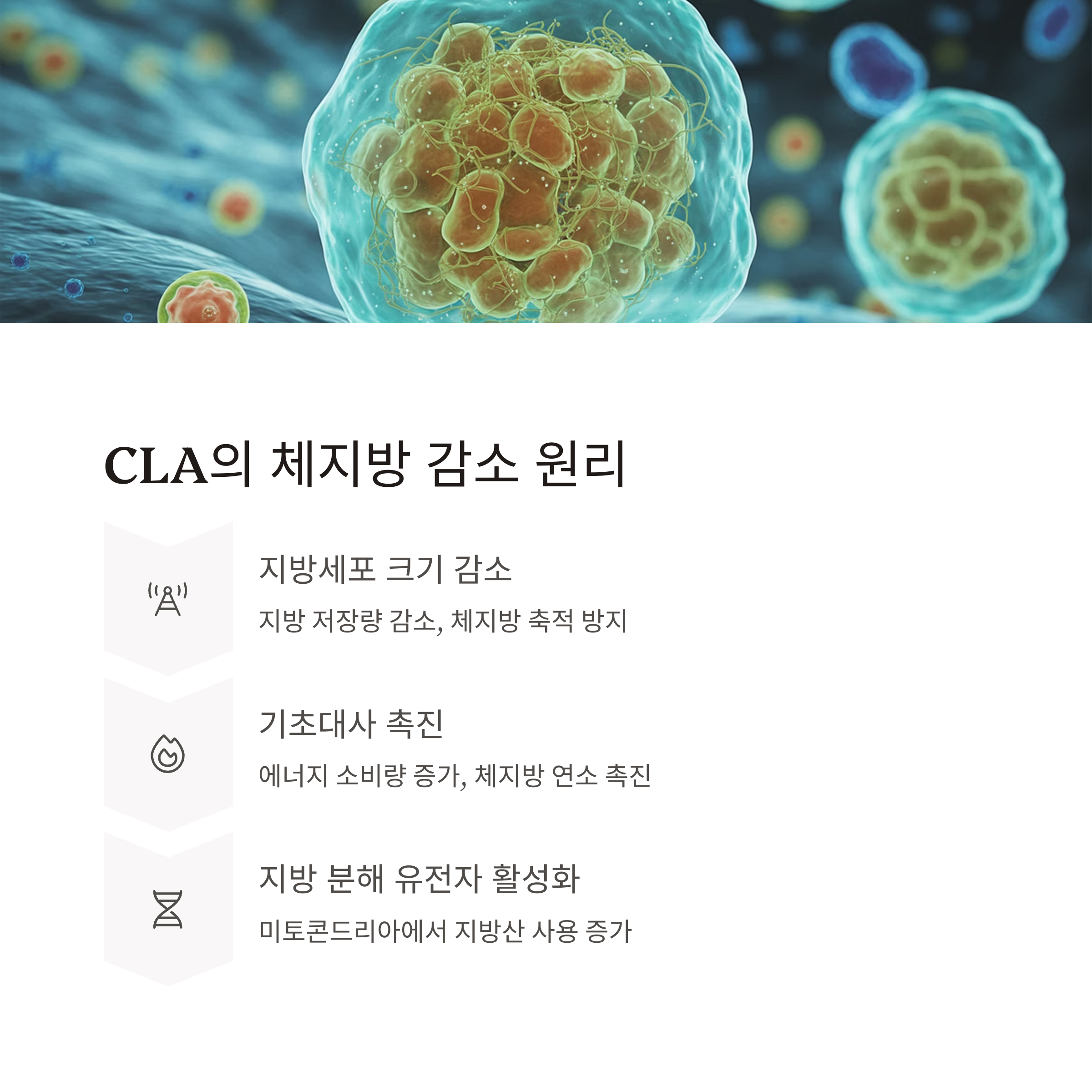 CLA는 ‘공액리놀레산’이라는 불포화 지방산으로, 지방세포 내에서 다음과 같은 작용을 통해 체지방 감량에 영향을 줍니다.
