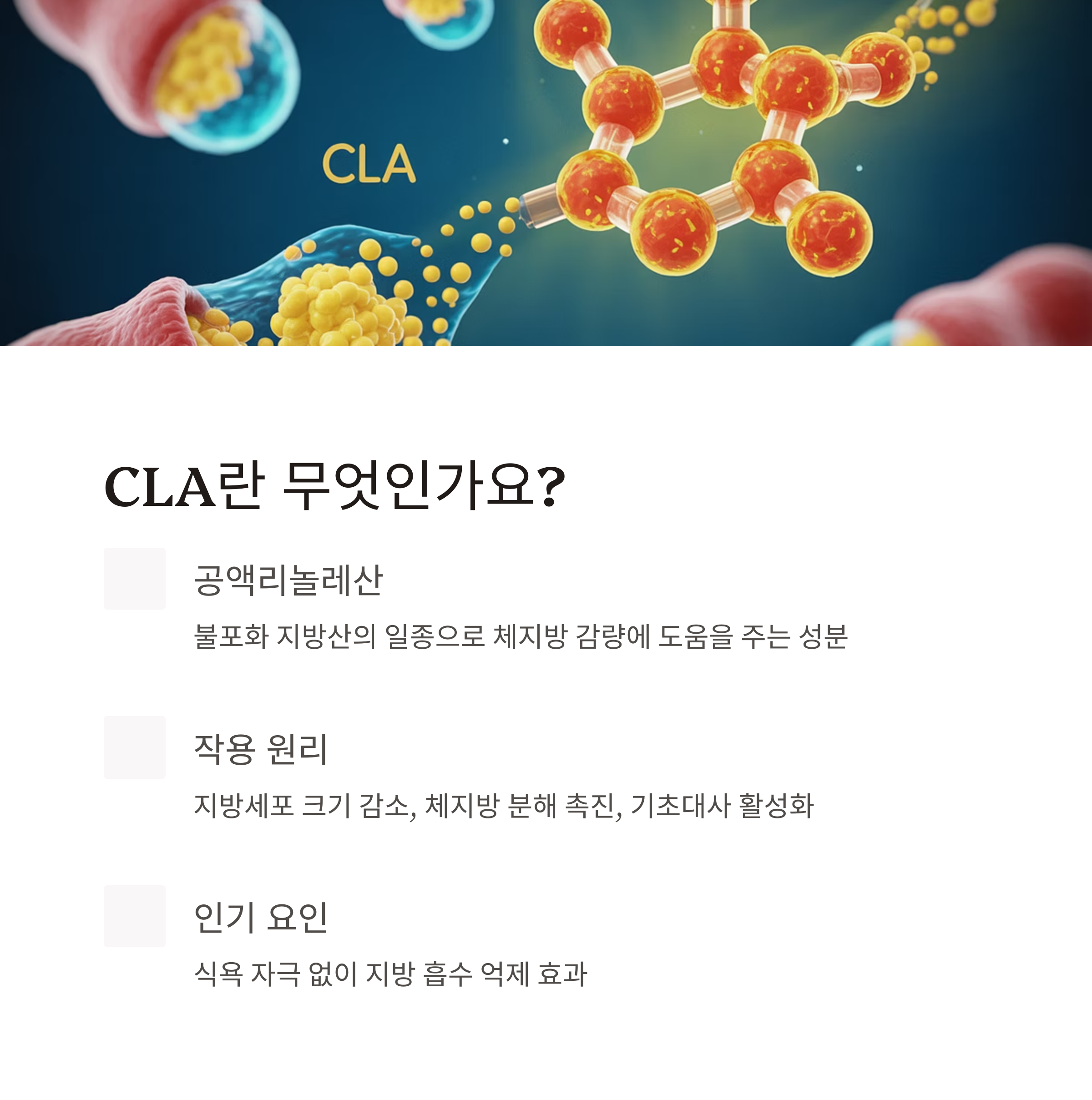 단기적인 수치 변화보다는 ‘지방이 쉽게 쌓이지 않는 체질’을 만들어주는 데 집중할 수 있다면, CLA는 분명히 체지방 감량에 있어 유용한 도구가 될 것입니다.