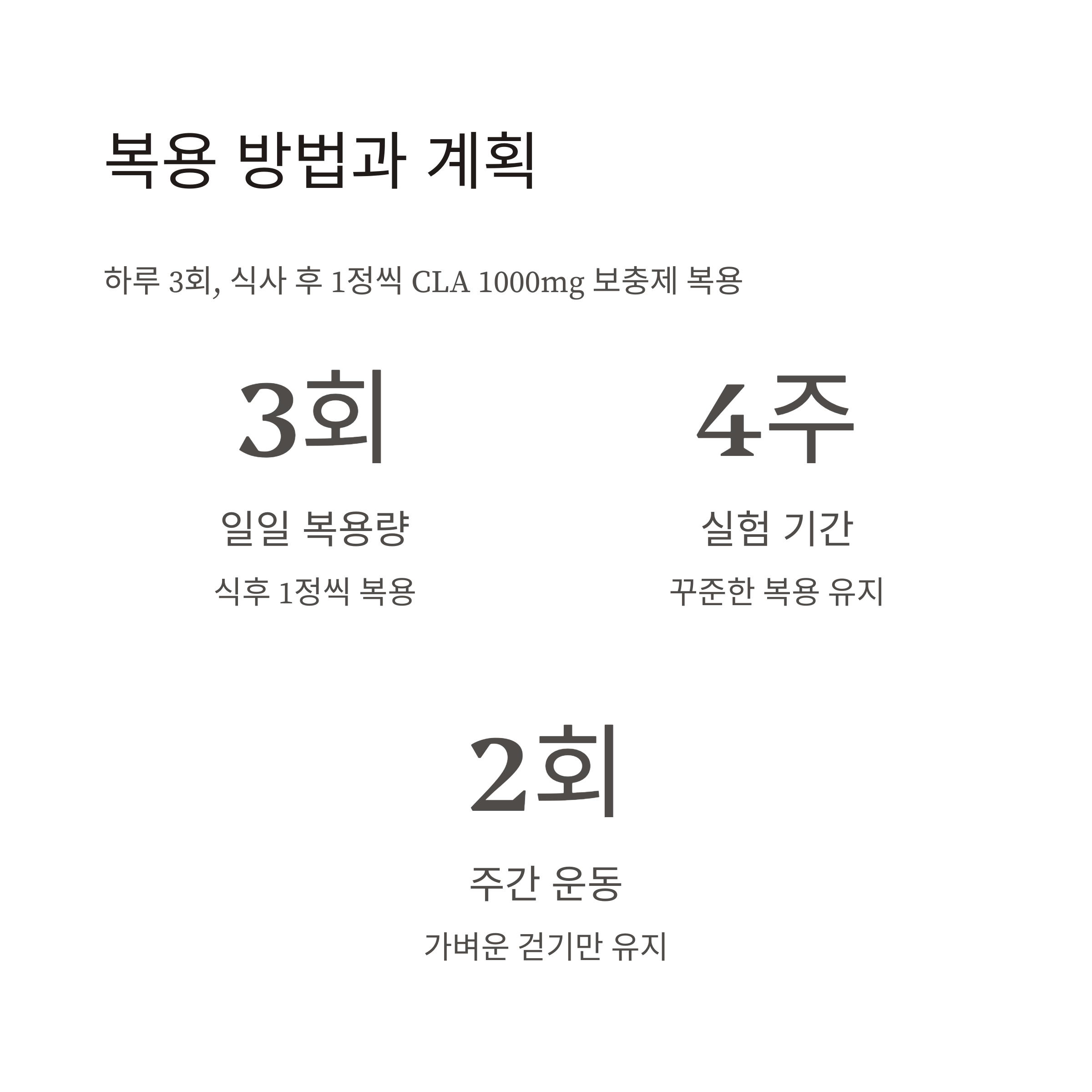 제가 선택한 제품은 하루 3번 식사 후 1정씩 복용하는 1000mg CLA 제품이었으며, 운동은 주 2회 걷기만 유지하고 보충제 효과에만 집중하기 위해 식단 조절은 하지 않았습니다.